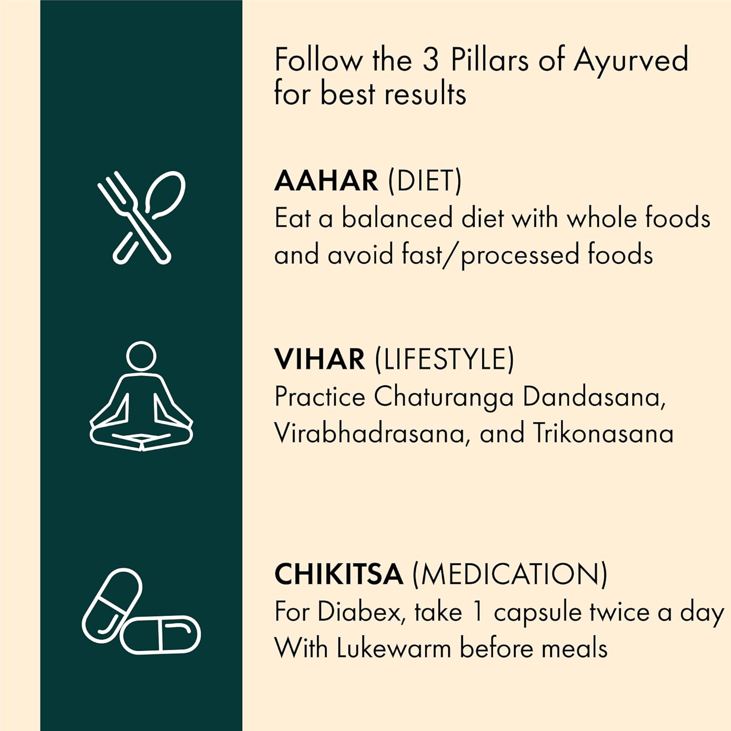 RECOMMENDED DOSAGE: For Severe Cases – 2 capsules, thrice a day, before meals. For Moderate Cases – 2 capsules, twice a day, before breakfast and dinner. For Borderline Cases- 1 capsule, twice a day, or as directed by a physician. To get the best results, consume Diabex in doctor-recommended doses and make suitable dietary and lifestyle changes. (Note: If you feel uncomfortable and/or nauseous when this product is taken before meals, ensure that it is taken after 1-2hrs after meals instead.)