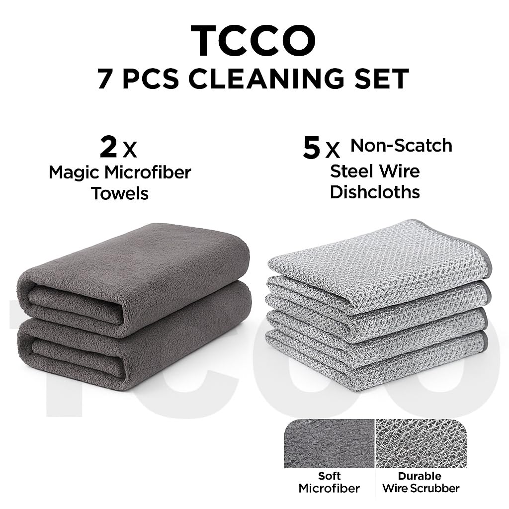 TCCO 7 PCS Kitchen Cleaning Cloth Set – 2 Thickened Magic Microfiber Towels & 5 Non-Scratch Steel Wire Dishcloths, Reusable & Absorbent Rags for Dishes, Pots, Pans, Car & Household Cleaning