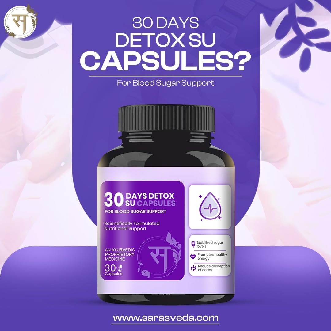 Support your journey to balanced blood sugar levels naturally with our 30 Days Detox SU Capsules. This Ayurvedic proprietary medicine is designed to help regulate blood sugar, boost energy, and improve carb metabolism—all in just two capsule a day.
