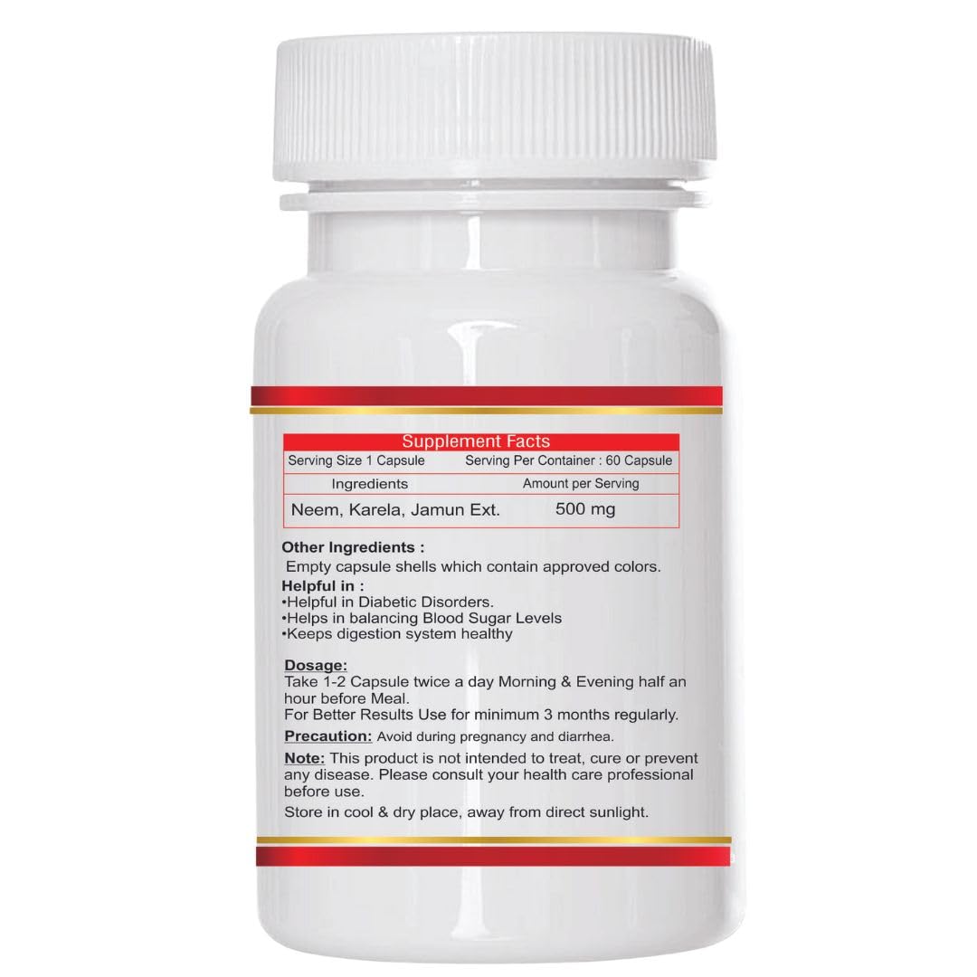 Diabetic Care Capsules Ingredients: These capsules contain extracts of Karela (bitter gourd), Jamun (Indian blackberry), Neem, and Methi (fenugreek), which collectively provide a potent combination of natural elements known for their potential benefits in diabetes management.