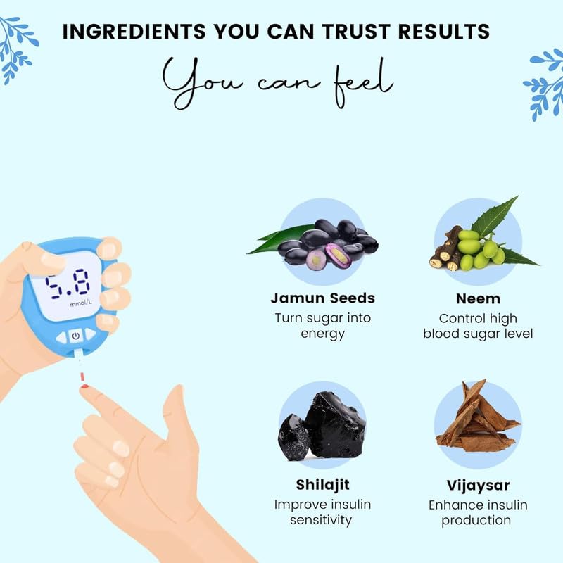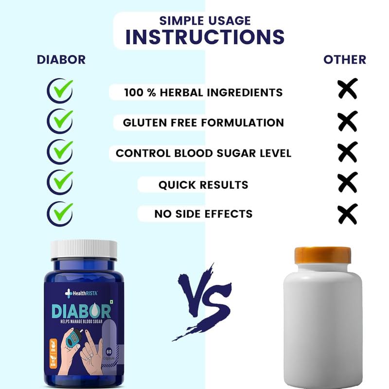 NATURAL BLOOD SUGAR SUPPORT: HealthRISTA Diabor supplements contain Karela, Gudmar, Jamun Seed, Neem, Tulsi, Meethi, Saunf, Chirayata, Vijaysar, Bael Leaves, Shilajeet which help control blood sugar levels and regulate glucose naturally.