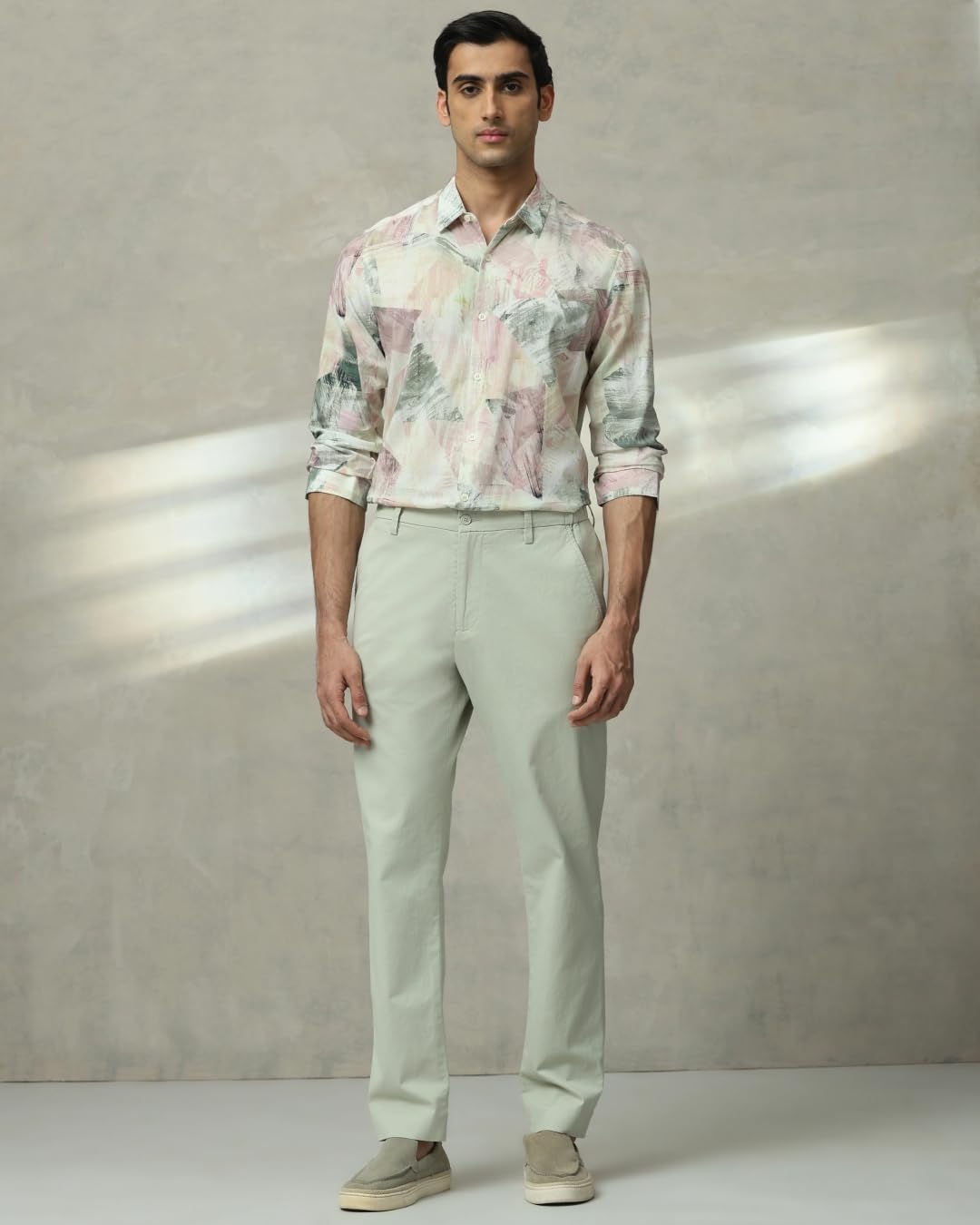 Make a bold statement with this eye-catching light pink shirt. Featuring an abstract pattern on a cotton-viscose blend, this regular-type shirt offers both style and comfort. The slim fit accentuates your physique, while the spread neckline adds a touch of sophistication. With full-length sleeves, this versatile piece transitions seamlessly from day to night, making it a must-have addition to any fashion-forward man’s wardrobe.
