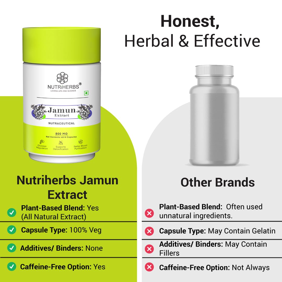 Ayurvedic Sugar Control Formula: Nutriherbs Jamun Capsules are formulated with Jamun Seed and Fenugreek Extracts, known for their ability to promote balanced blood sugar and improve insulin sensitivity.
