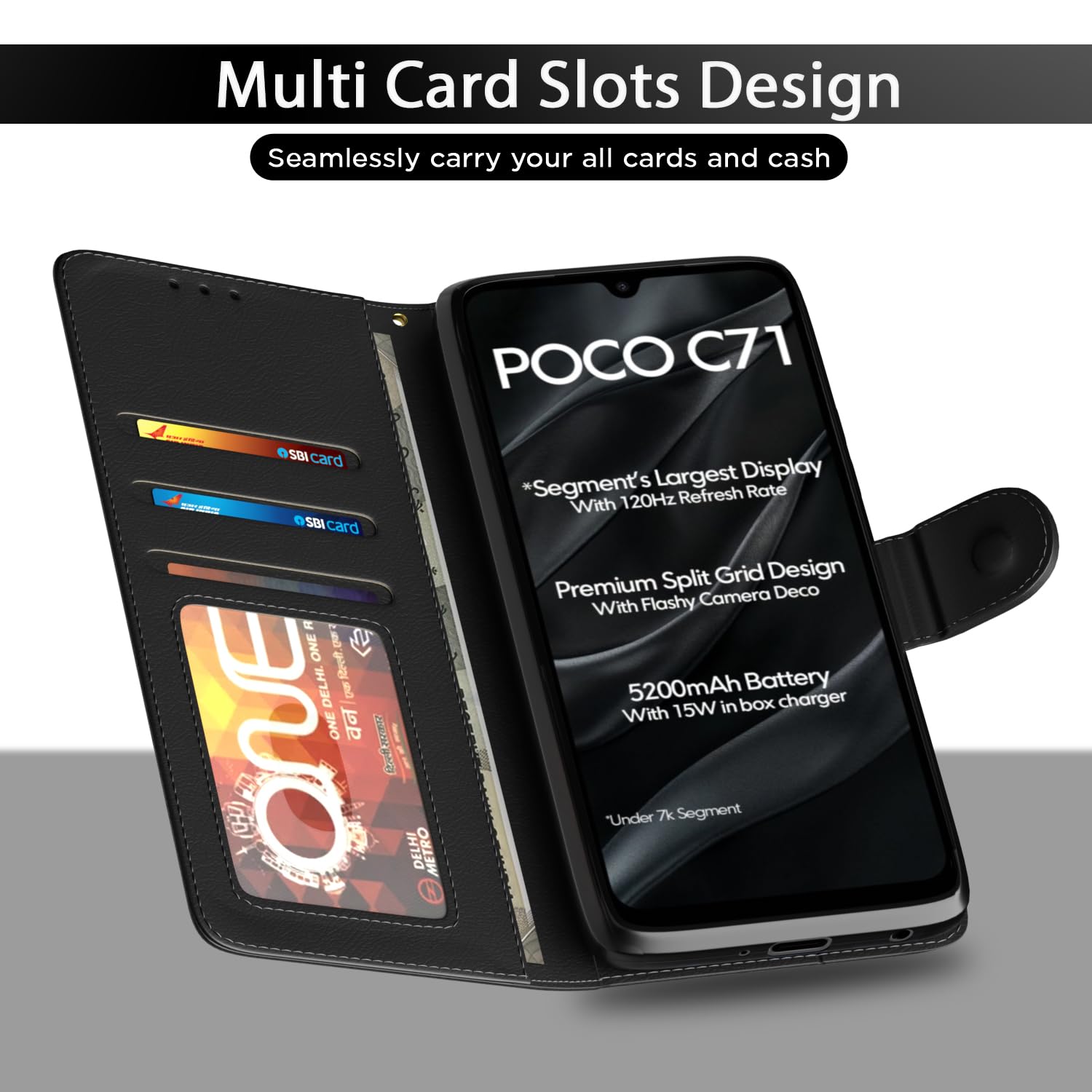 Outlouders Flip Cover for Poco C71 / Redmi A5 | Leather Finish | Card Slots | Wallet Stand | Shockproof Protection Flip Case (Black)