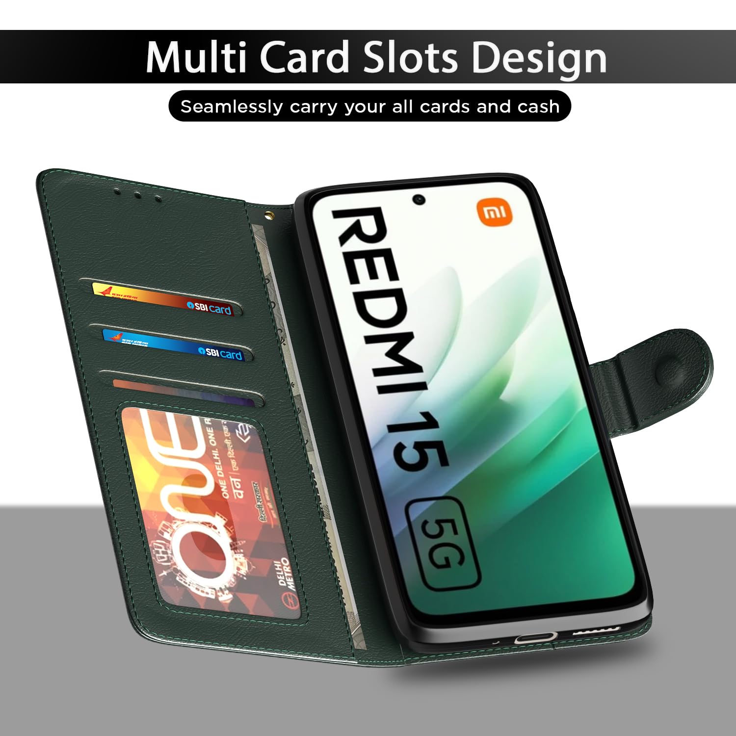 Outlouders Flip Cover for Redmi 15 5G | Leather Finish | Card Slots | Wallet Stand | Shockproof Protection Flip Case (Green)