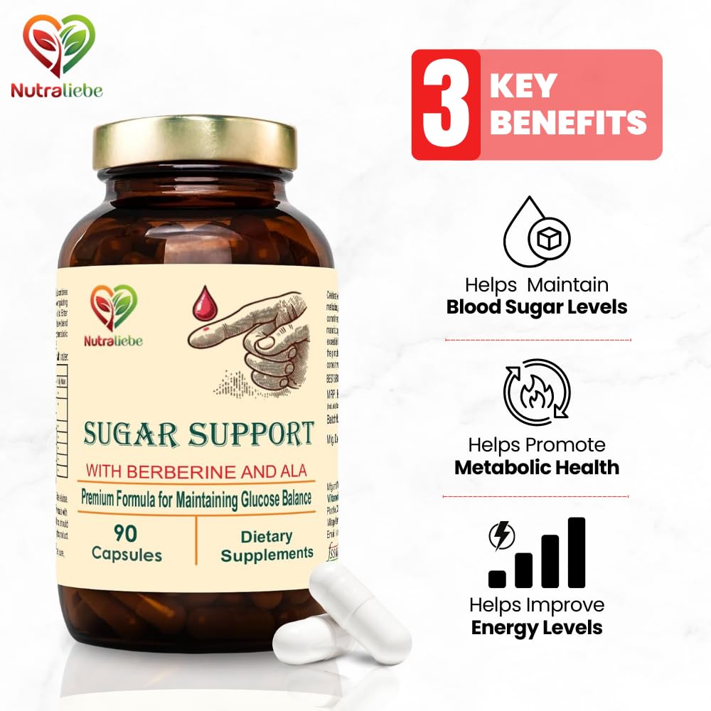 Glucose Control: NutraLiebe Premium Blood Sugar Support offers natural glucose control with potent ingredients like berberine, bitter melon, and cinnamon.