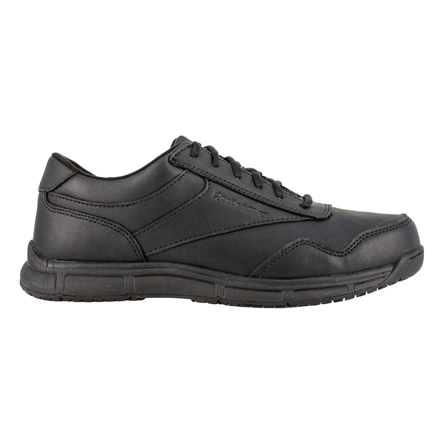 The reliable protection and comfortable fit of the Reebok Work Jorie LT oxford keeps you safe from hazards during your workday.Style number: RB1130 (Black).Synthetic leather upper can be easily cleaned.Soft toe work shoe with electrical hazard protection. 100% non-metallic.Moisture-wicking nylon mesh lining for better breathability. Removable memory foam footbed provides underfoot cushioning and support. Lightweight EVA midsole delivers cushioned support.Outsole features beveled heel and flex grooves for a natural walking stride.Durable rubber outsole with excellent slip, oil, chemical, heat, and abrasion resistance. The outsole is also resistant to metal chips. Soft toe meets ASTM F2892, EH (electrical hazard) protection, and is security friendly.Imported.Measurements: Weight: 1 lb 1 oz Product measurements were taken using size 11.5, width 3E – Extra Wide. Please note that measurements may vary by size.Weight of footwear is based on a single item, not a pair.