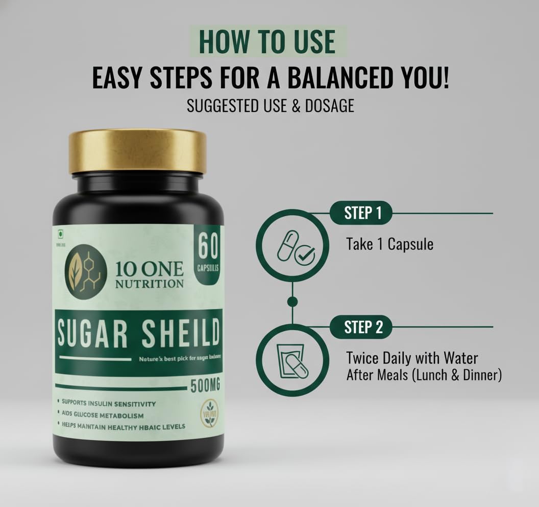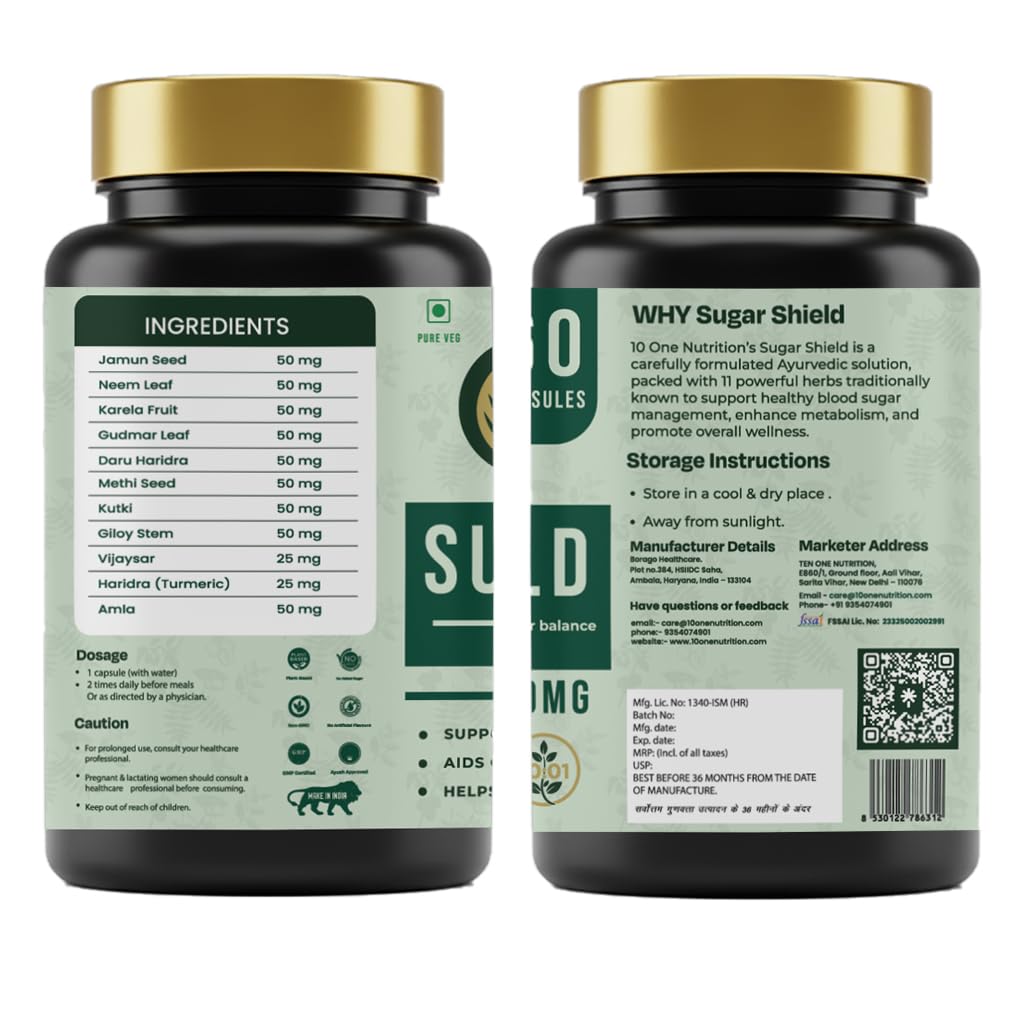 Sugar Shield 500mg | Helps Manage Blood Sugar Levels With Karela, Jamun & Gudmar & 8 more herbs | 100% Ayurvedic Capsule with Powerful Herbs | 60 Veg Capsules