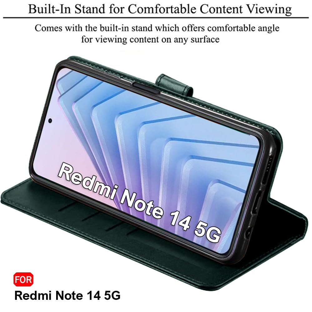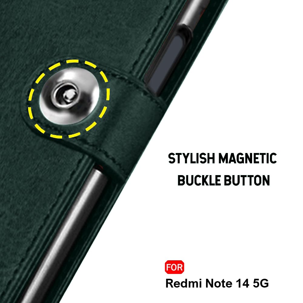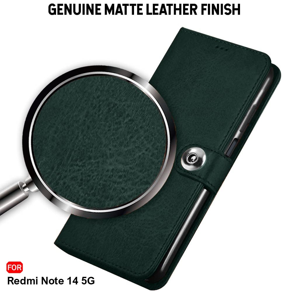 TheGiftKart Flip Cover Back Case for Mi Redmi Note 14 5G | Genuine Leather Finish | Designer Button | Inbuilt Pockets & Stand | Flip Back Cover Case for Redmi Note 14 5G (Faux Leather, Green)