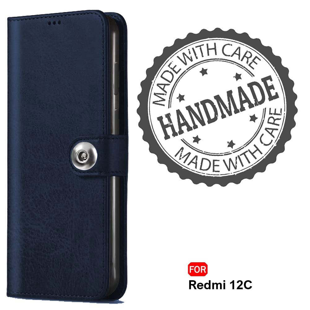 TheGiftKart Genuine Leather Finish Flip Back Cover Case for Mi Redmi 12C | Inbuilt Pockets & Stand | Wallet Style | Designer Button Magnet Flip Cover Back Case for Redmi 12C (Blue)