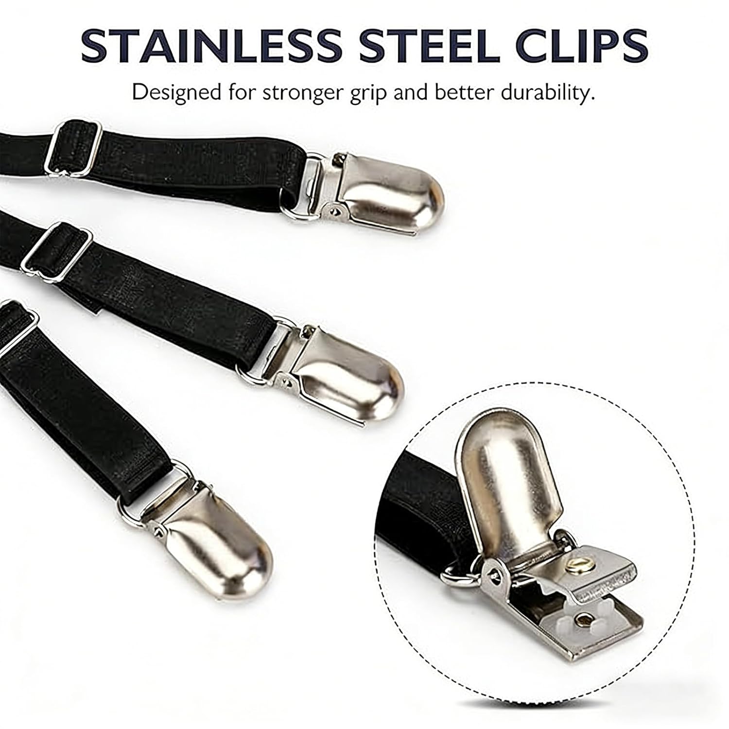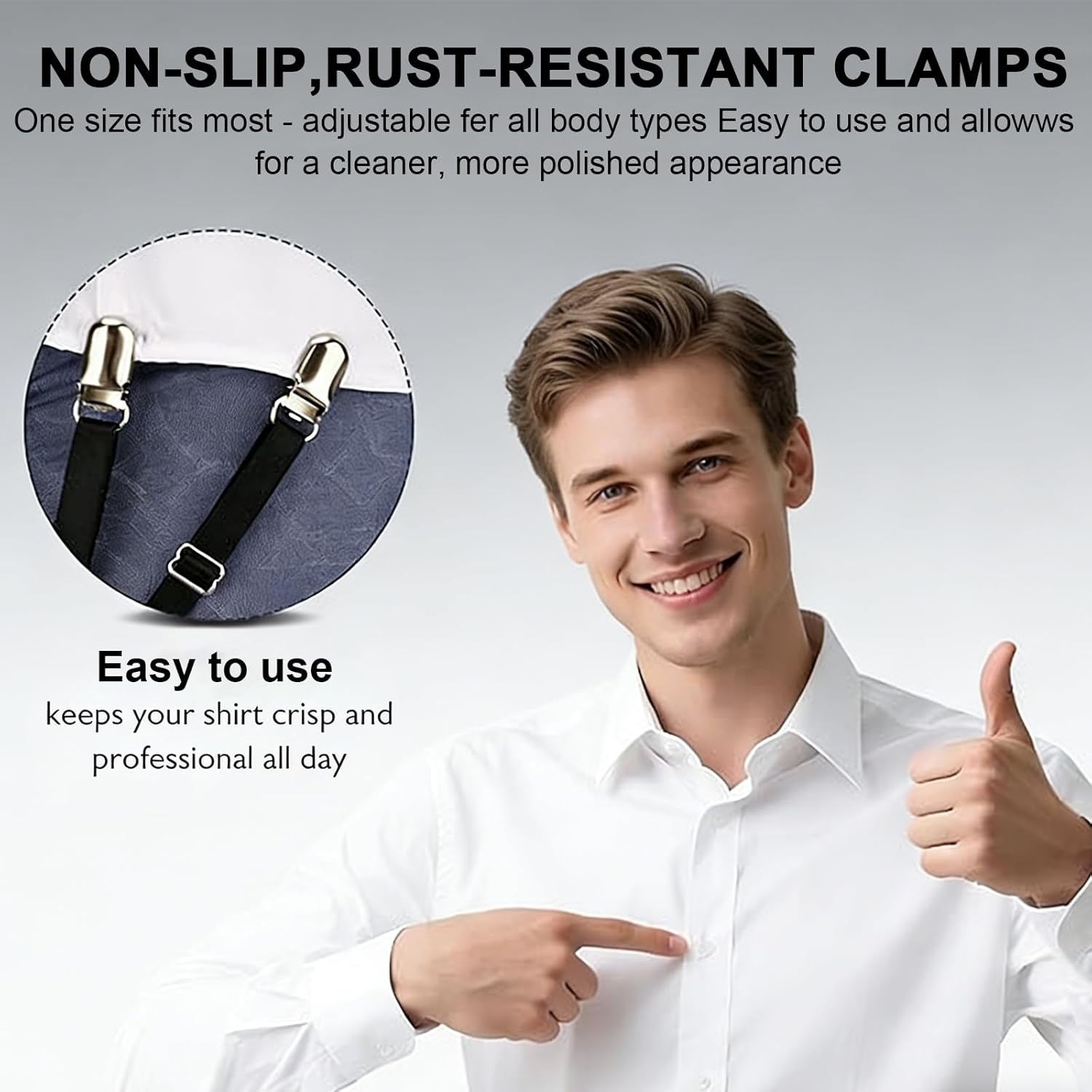 High-Quality Material: This shirt stays for men is made from a blend of cotton, polyester, and spandex. It offers great flexibility and elasticity, is soft to the touch, comfortable to wear, and prevents irritation. It features an advanced, non-slip buckle. shirt stays for men Designed for the modern gentleman, it’s easy to use for anyone, whether a police officer, soldier, lawyer, or daily commuter.