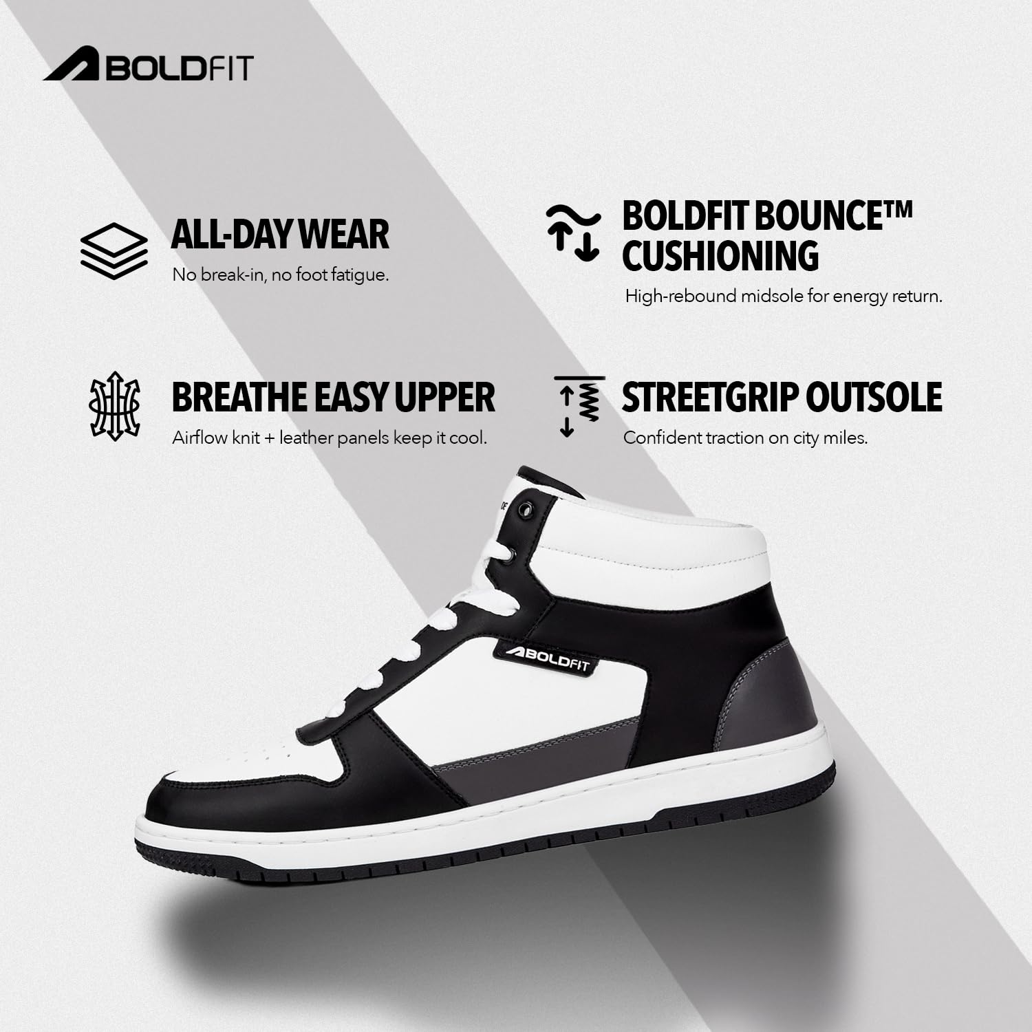 Boldfit introducing the ZeonX mens High-Top Sneakers. Command attention with a premium PU leather upper and ankle-hugging design, offering enhanced support and a bold, stylish look. The Lycra lining provides a supremely soft, irritation-free, and snug fit, ensuring all-day comfort. Engineered for durability, the lightweight TRP sole delivers superior cushioning and reliable shock absorption, perfect for street style or your gym workout. A high-performance rubber outsole guarantees exceptional grip and stability on any terrain, enhancing ankle security. These versatile high-top shoes are ideal for active daily routines, blending durable function with a dominating fashion statement. The ultimate sneaker shoes for men. Elevate your presence and comfort.