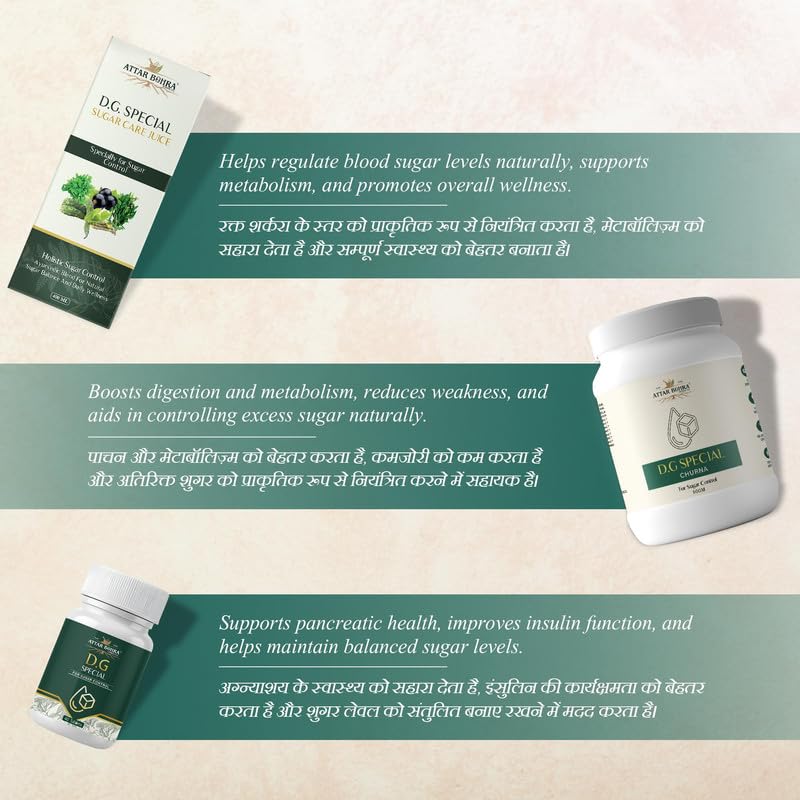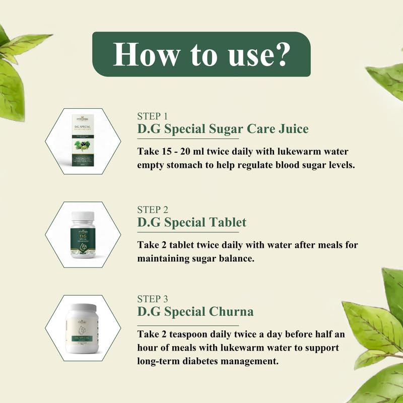 Diabetes Care Kit | DG Special Juice Tablet Churna Combo | Ayurvedic Support for Sugar Control Digestion Blood Purification Constipation Relief