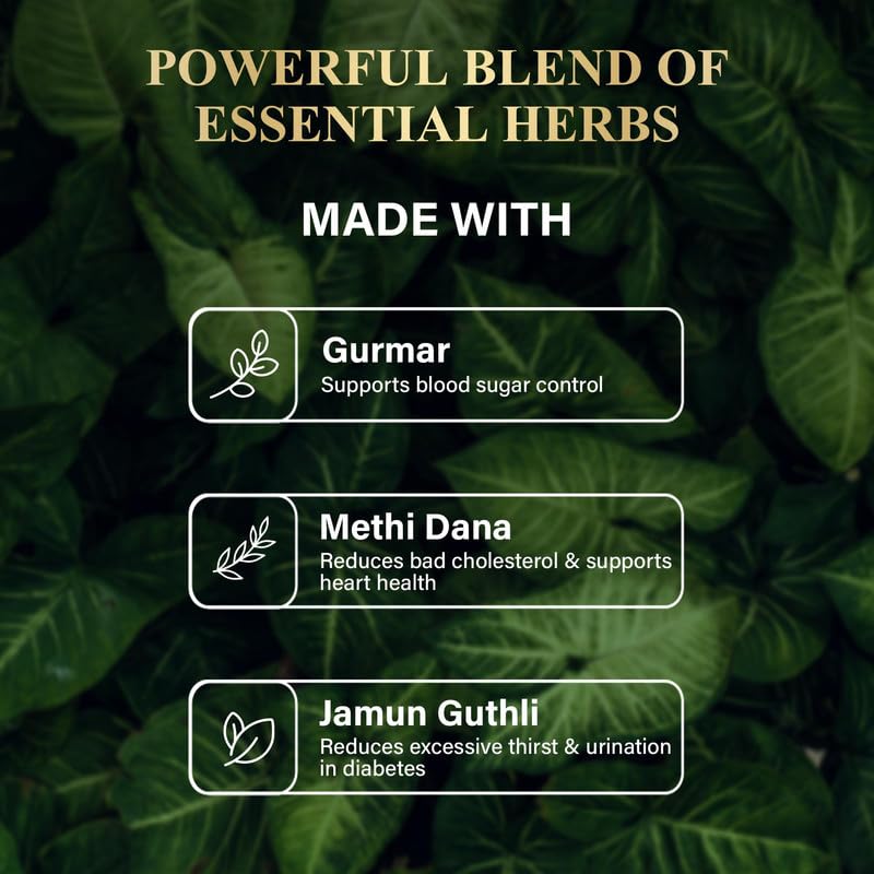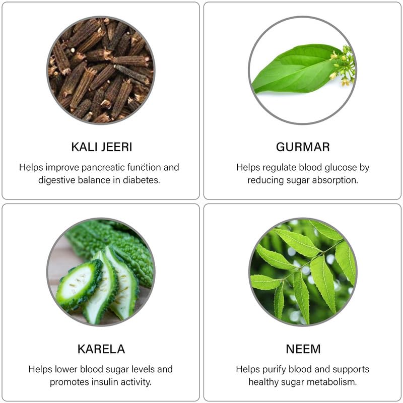 Formulated with gurmar, methi, jamun guthli, kali jeeri, karela and neem to naturally regulate sugar levels, purify blood, enhance liver health and strengthen overall immune function.