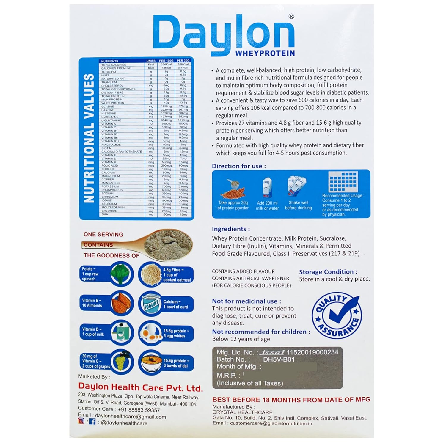 Whey protein concentrate, Micellar Casein, Milk protein, Sucralose, Dietary fibre, Cocoa Powder, Vitamins and minerals Directions: To prepare one serving, add 200 ml milk or water to glass containing (approx 30g) content. Shake well before drinking.