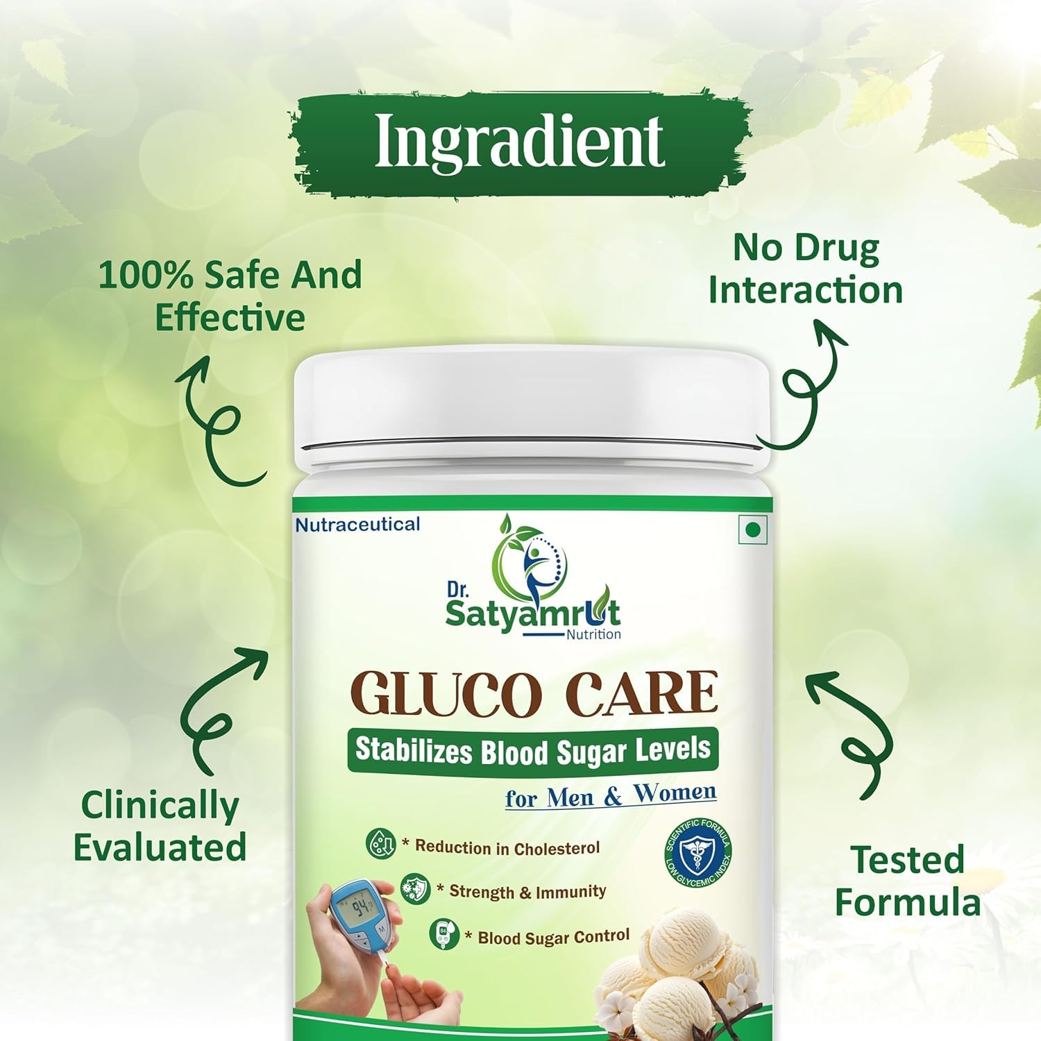 Gluco Care Diabetic Vanilla – Complete Nutrition for Sugar Control & Active Living Gluco Care Diabetic Vanilla is a scientifically balanced, sugar-free nutritional supplement specially formulated for people with diabetes and prediabetes. It combines the goodness of high-quality protein, fibre, and essential vitamins and minerals to help manage blood sugar levels, support steady energy release, and promote overall health. With a smooth vanilla flavour, this low-glycemic formula provides balanced nutrition without spiking blood glucose and vitality – Its smooth vanilla flavour makes daily nutrition delicious, while the low glycemic index (Low-GI) formula helps prevent glucose spikes and keeps you active throughout the day. Daily Value Features Calorie 130.87 cal Total Carbohydrate 14.12 % Protein 11.1 % Dietary Fiber 5.7 % Fat 2.06 % Potassium 310 % Sodium 6 % Cholesterol 12 % Calcium 141.19 % Other Daily Value Features Protein, Energy, Calcium, Vitamin-D, Iron, Fiber Usage Timings :Early Morning, Pre-workout, Post-workout Nutrient Content :Energy 130.87 kcal, Protein 11.10 gm, Total Carbohydrate 14.12 gm, Dietary Fiber 5.70 gm, DHA ( 20% Algae Source ) 0.38 gm