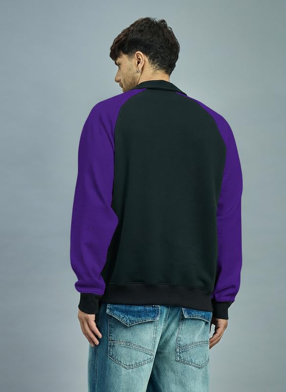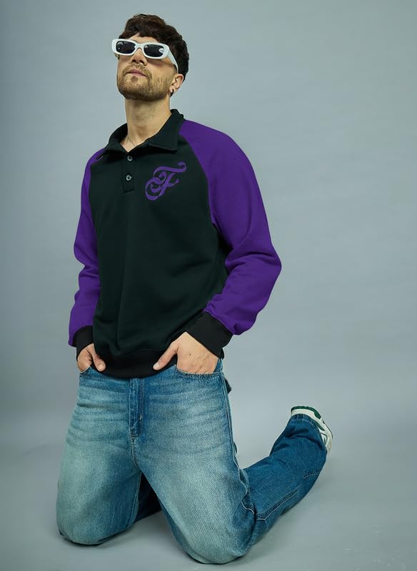 FUGAZEE Black & Purple Raglan Polo Sweatshirt | 300 GSM Soft Touch Cotton Fleece | Polo Neck with Button Placket | Contrast Raglan Sleeves, Embroidered Monogram