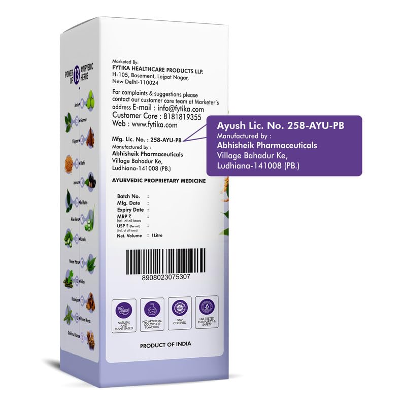 Fytika Glycobalance Diabetic Juice – 1L | Blend of 13 Ayurvedic Herbs | Amla, Guduchi, Methi, Neem, Karela, Jamun | 100% Ayurvedic Herbal Juice for Men & Women (Pack of 1)