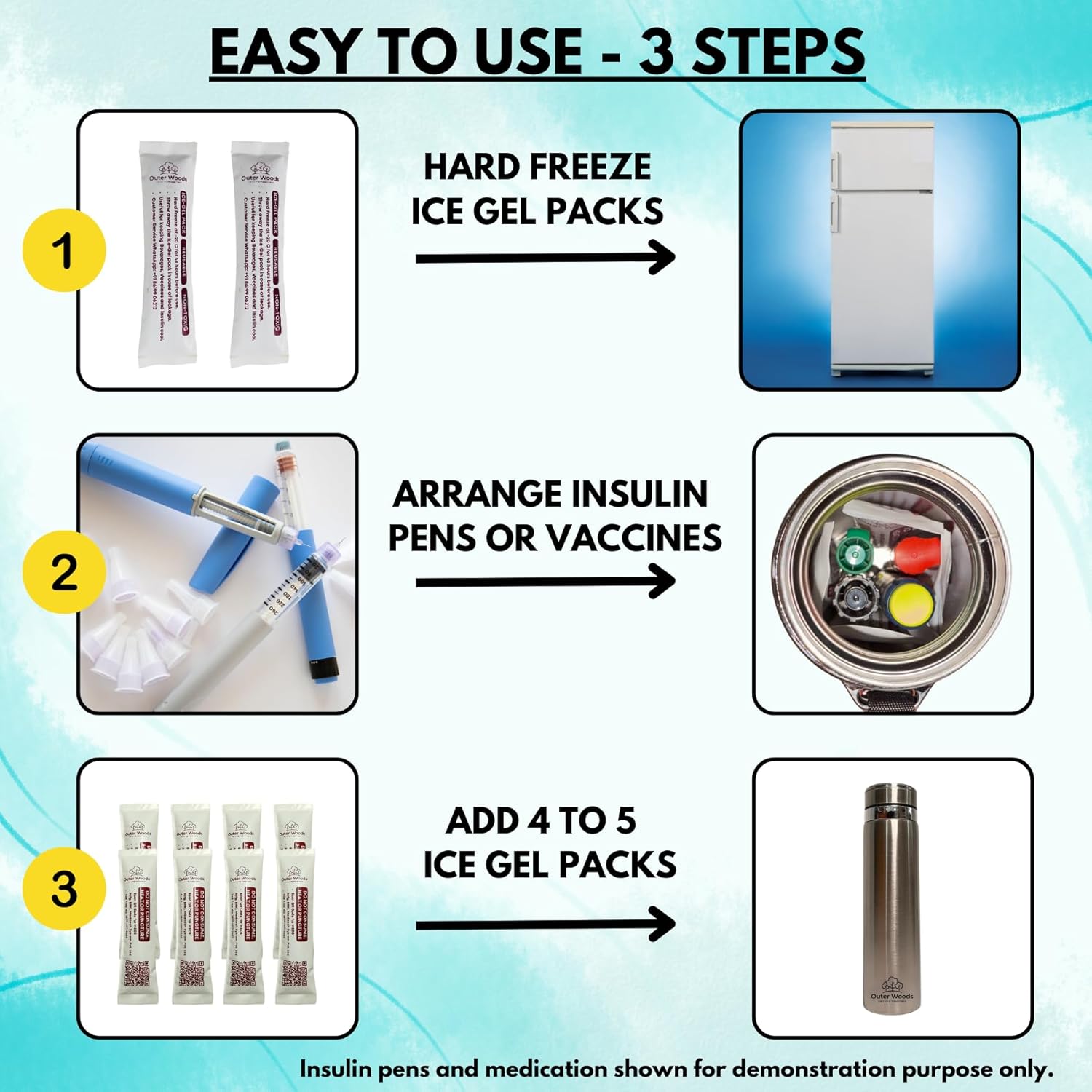 ✅ Easy to Use & Reusable: Simply Hard freeze the mini ice gel packs, insert them into the insulated bottle, and place your insulin inside—hassle-free cooling for diabetics on the go! Please use 4 to 5 ice gel packs at a time.
