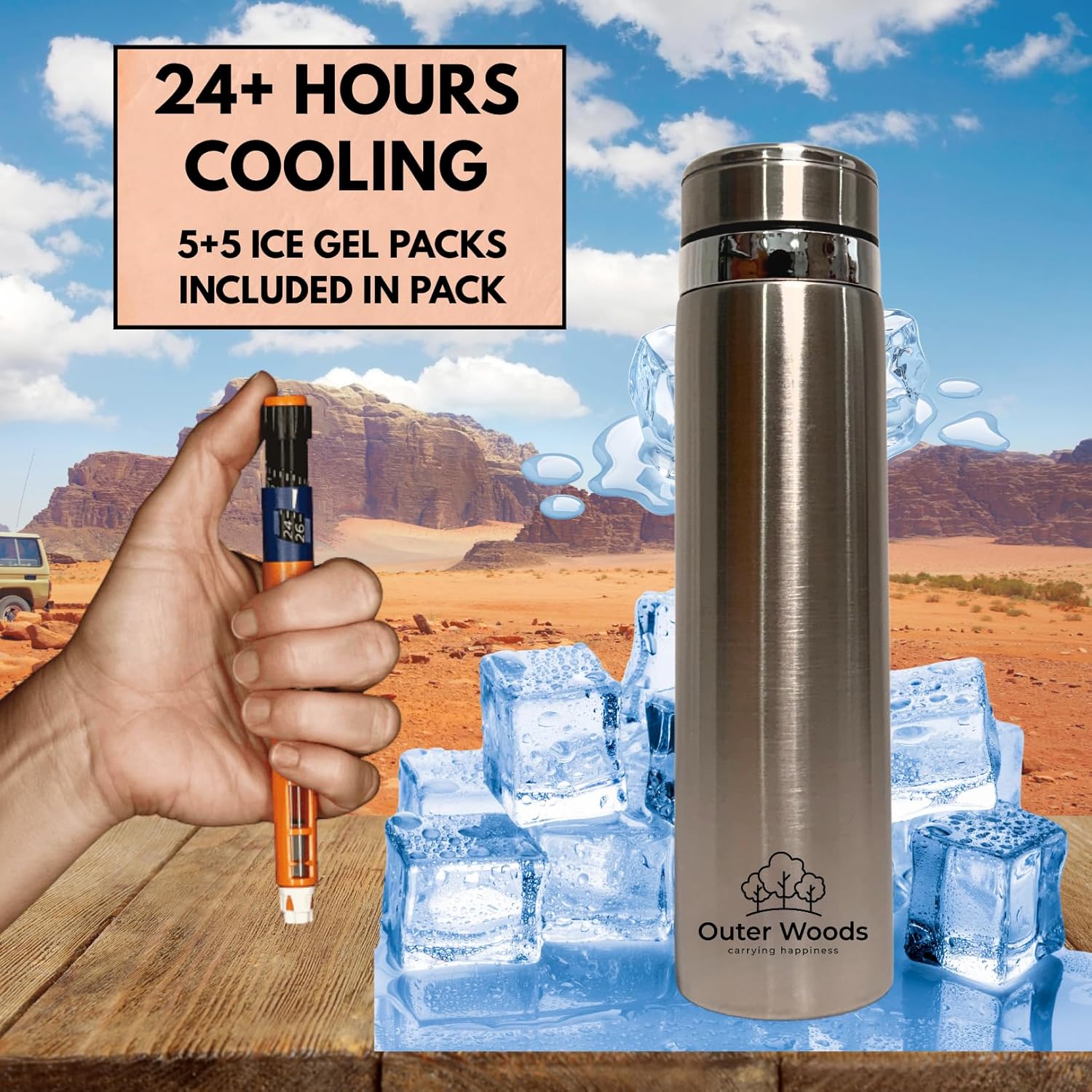 Insulin Cooling Bottle Large (1000ml) | 24+ Hours Cooling Insulin Travel Cooler | Includes 5+5 Ice Gel Packs | Fits Insulin Pens up to 8.4 Inch | Silver