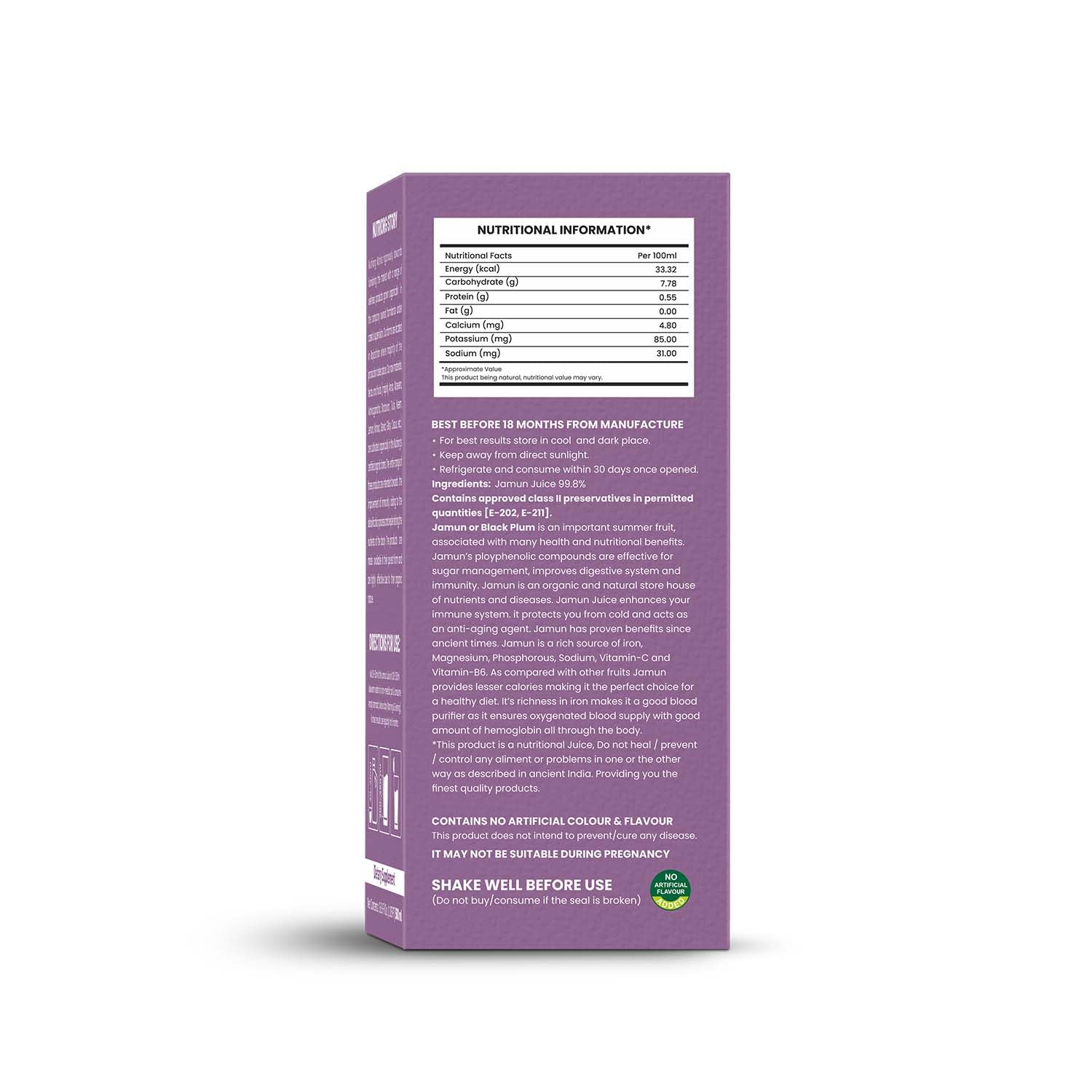 100% Pure, Fresh, & Natural: Prepared using the best organically grown Jamun, Nutriorg Jamun Juice contains no artificial additives, preservatives, or harmful chemicals. Every sip is full of health in pure cold-pressed jamun fruit.