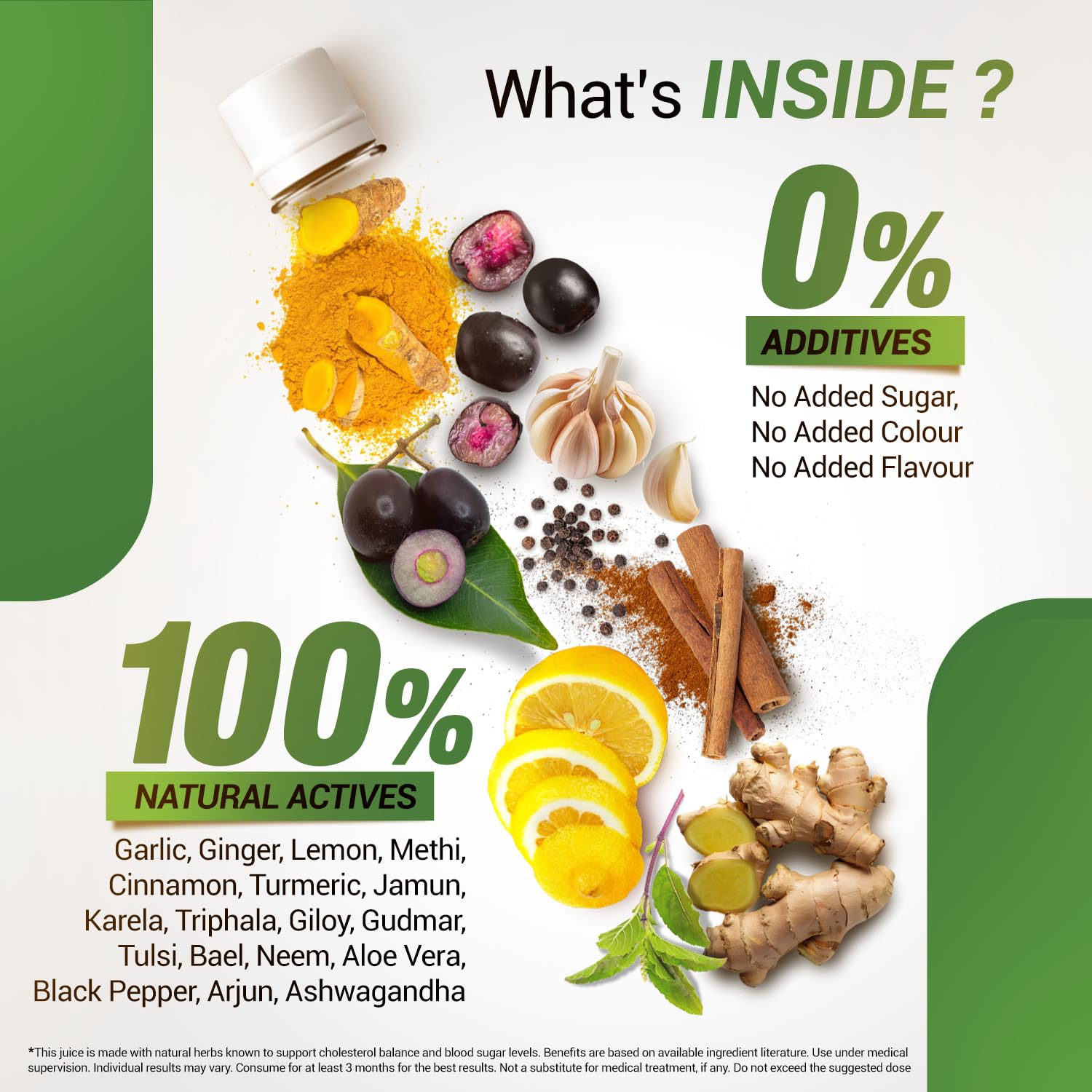 How to Consume: Dilute 30 ml of juice in 100 ml of water. Consume twice daily once on an empty stomach in the morning, and again 30 minutes post-dinner. For best results, use for at least 3 months.