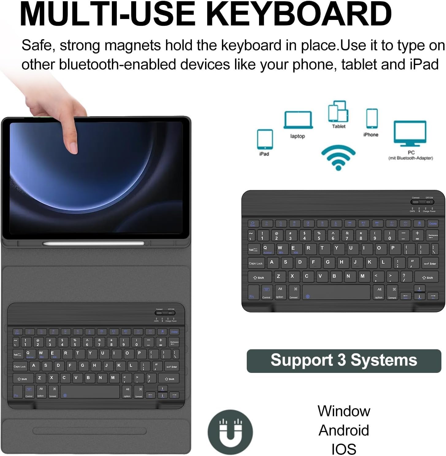 Real hard laptop style keyboard with high end ABS material. Not cheap silicone keyboard as other cases in market. A spring mechanism underneath each key ensures a tactile response with every stroke, helping you to type faster and with less error than on a touchscreen. Support auto sleep/wake function by CASE ONLY mode