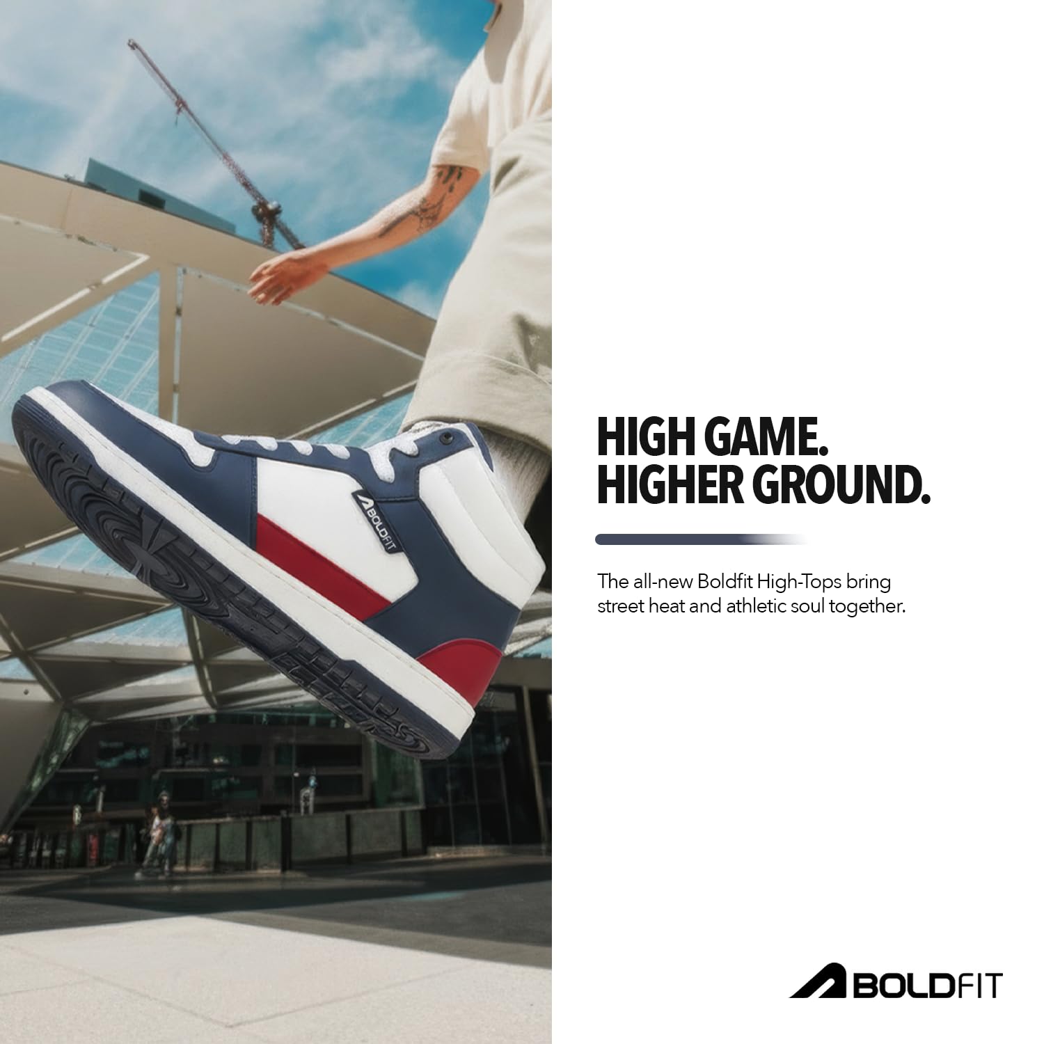 Boldfit introducing the ZeonX mens High-Top Sneakers. Command attention with a premium PU leather upper and ankle-hugging design, offering enhanced support and a bold, stylish look. The Lycra lining provides a supremely soft, irritation-free, and snug fit, ensuring all-day comfort. Engineered for durability, the lightweight TRP sole delivers superior cushioning and reliable shock absorption, perfect for street style or your gym workout. A high-performance rubber outsole guarantees exceptional grip and stability on any terrain, enhancing ankle security. These versatile high-top shoes are ideal for active daily routines, blending durable function with a dominating fashion statement. The ultimate sneaker shoes for men. Elevate your presence and comfort.