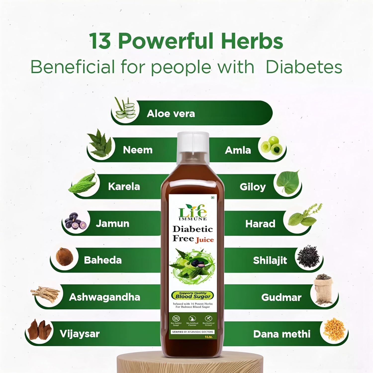 Life Immune Diabetic Free Juice is a natural Ayurvedic formulation crafted with 16 carefully selected herbs known in traditional wellness for supporting healthy blood sugar levels, metabolism, and digestion. This potent blend combines Aloe Vera, Jamun, Karela, Neem, Amla, Giloy, Harad, Baheda, Ashwagandha, Vijaysar, Shilajit, Gudmar, Dana Methi, and more—offering a holistic approach to daily wellness. It is free from adMultided sugar, artificial flavors, and colors, ensuring a pure and natural experience. Verified by Ayurvedic doctors, this juice is suitable for adults looking for herbal support in managing sugar levels and boosting immunity. For optimal benefits, take 30 ml twice daily for at least 3 months along with a balanced diet and exercise.