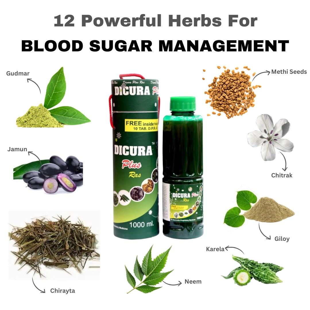 Dicura Plus Ras Syrup 1000 ml | Ayurvedic Blend for Blood Sugar Control | Made with Karela, Gudmar, Jamun, Chirayta, Giloy, Neem, Chitrak & Methi seeds | Pure & Natural Juice for Diabetic Care