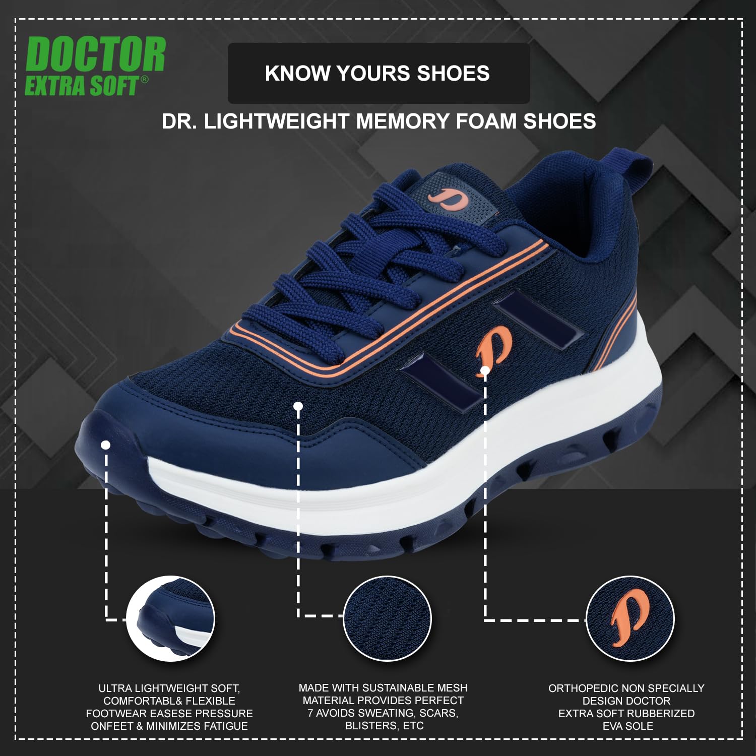 Add these Wonderful Doctor Extra Soft’s Comfortable & Light Weight Memory Foam Running Shoes For Mens to your Shoe Closet. Brought to you by FAMILY FOOTWEAR, these Memory Foam shoes are not only Flexible and Lightweight, but also extremely Comfortable to wear. Now, you can keep your feet comfortable with this pair of Doctor Extra Soft Footwear for Men that have been skillfully crafted to provide optimum support to your ailing Feet. It is Soft Padded and has been ergonomically designed to support and soothe feet suffering from orthopedic problems. Diabetic Foot problems relieve heel arch and Ankle Pains. Soft insole, Flexible sole for better walking comfort Extra Soft and Comfortable bottom for Heel Comfort. General foot Pain & Discomfort Heel Pain, Arch Pain Plantar Fasciitis, Diabetes, Back Pain, and Blood Circulation. They are Anti-Skid and Durable Shoes and Are Widely Used by Men of All Ages, Especially those Suffering from Diabetes, Plantar fasciitis, Orthopedic Pain, Heel Pain, Arch Pain, Ankle Pain, Knee Pain, and Back Pain, Good Rubber Grip Enables You to Use These Shoes on Wet Floors, Tiles, Marbles, Etc. This Rubber Sole Is Long-lasting and Provides Uninterrupted Daily Usage. Its Memory Foal Insole Increases Comfort, Eases Foot Pain, Increases Efficiency, Eases Pressure on Feet, Absorbs Heel Shock, and Minimizes Fatigue.