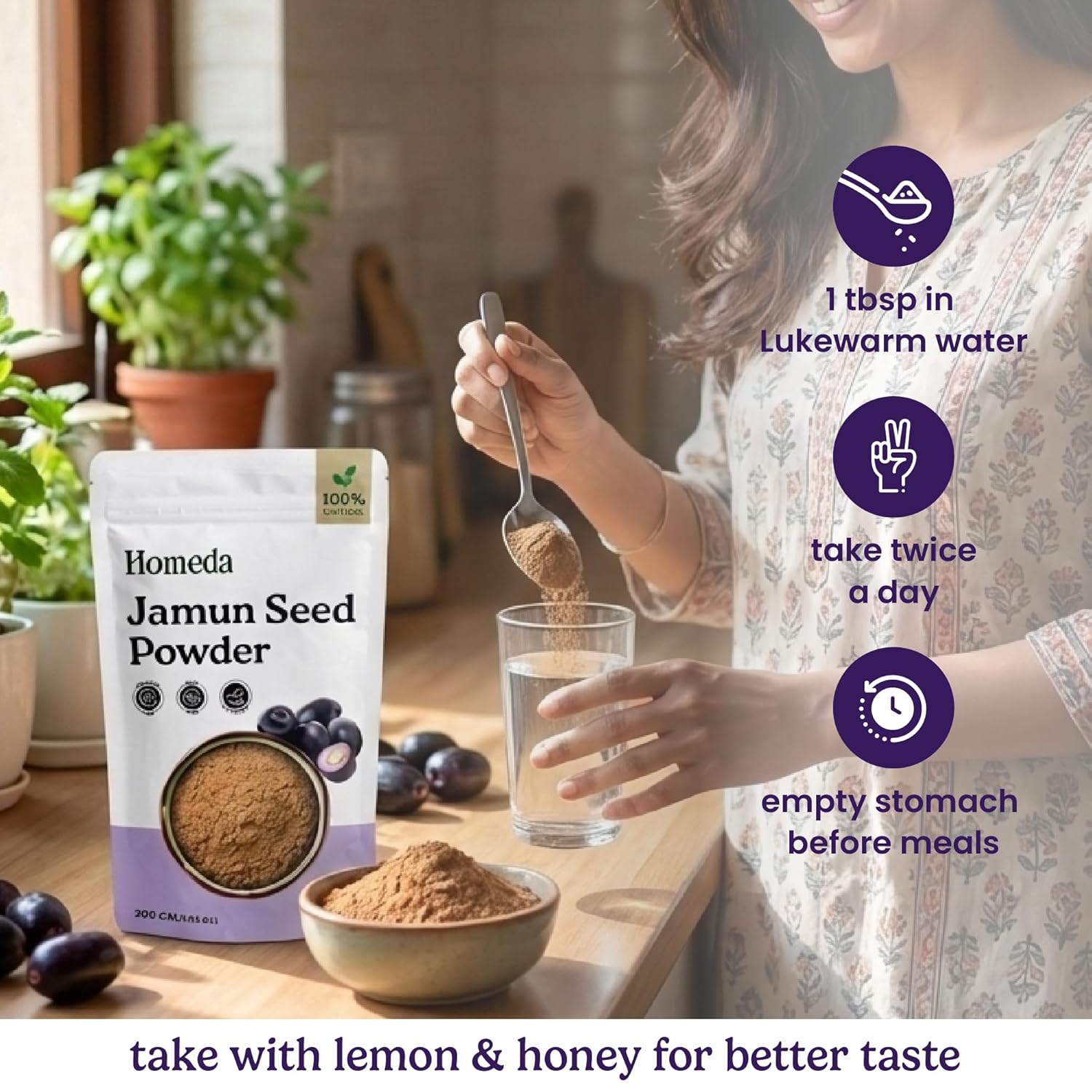 HOMEDA ORGANIC JAMUN SEED POWDER: YOUR DAILY DIABETES & WELLNESS SUPPORT. Sourced from the finest Organic Black Jamun ki Guthli (Kala Java Plum Seeds), our powder is specifically crafted to act as a natural Diabetes Control Powder. HOW TO CONSUME: The ideal Jamun Powder dosage for diabetes is generally 1/2 to 1 teaspoon daily, mixed with water or your favorite juice, preferably on an empty stomach. WHY SEEDS? The seeds are known to be far superior to the fruit pulp, concentrating the benefits. They are rich in flavonoids and other powerful antioxidants, which may assist your body’s detoxification process. STORAGE TIPS: To preserve the purity and potency, store your Neredu Naval Kottai Powder in an airtight container in a cool, dry place. It should not be refrigerated, as moisture can cause clumping and spoilage. Verify Purity by checking the organic certification on our packaging.
