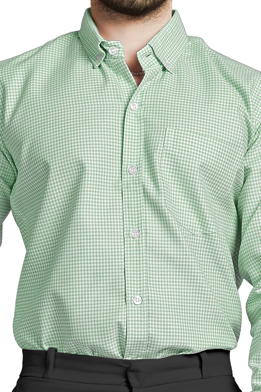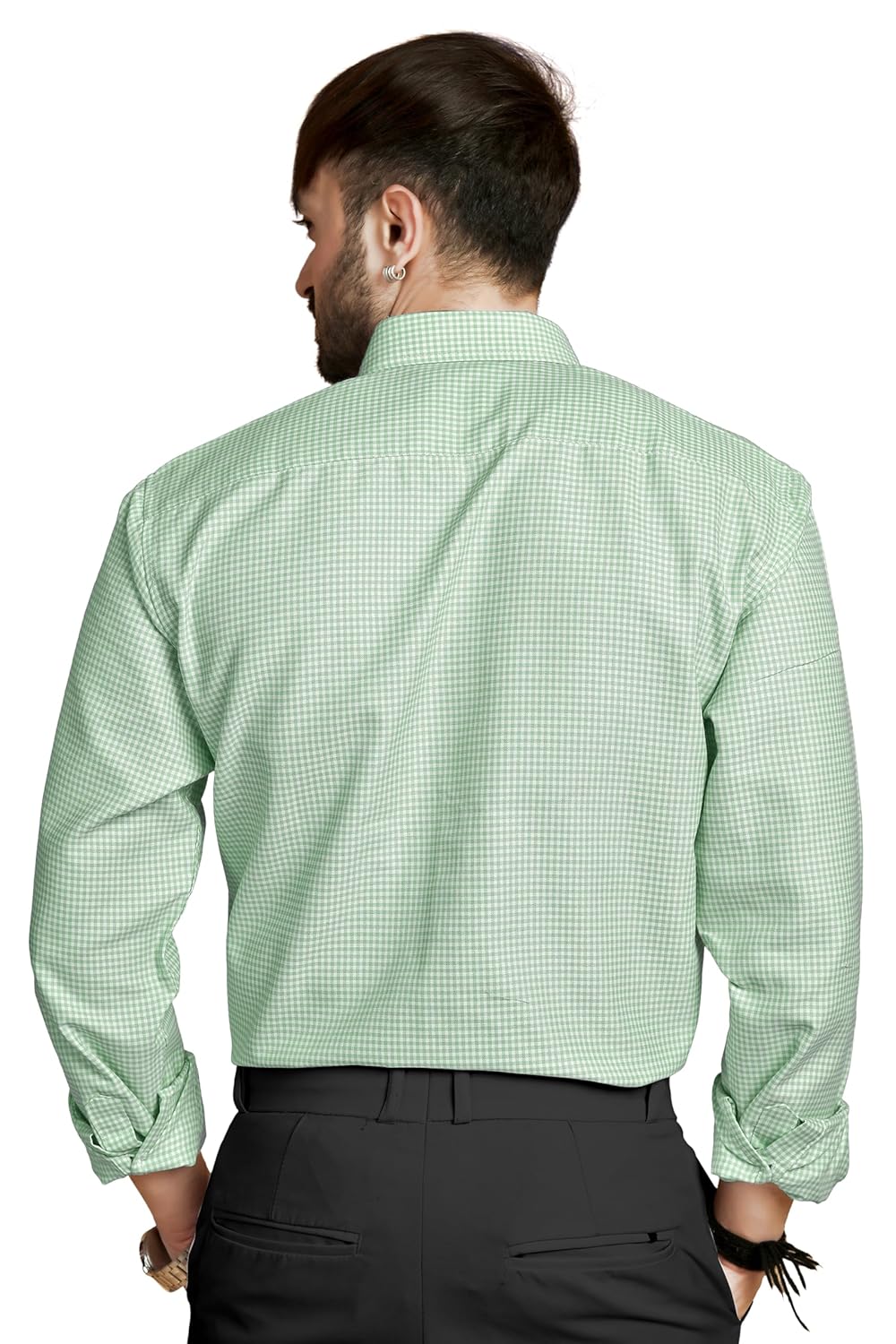 Upgrade your professional wardrobe with this refined men’s formal wear set, featuring a premium green micro-check shirt paired with sleek, expertly tailored black trousers. The shirt is crafted from a smooth, breathable, and lightweight fabric that offers lasting comfort throughout long workdays. Its subtle micro-check pattern provides a fresh yet sophisticated look, while the structured collar, button-down front, and neatly finished cuffs maintain a polished, professional appearance.