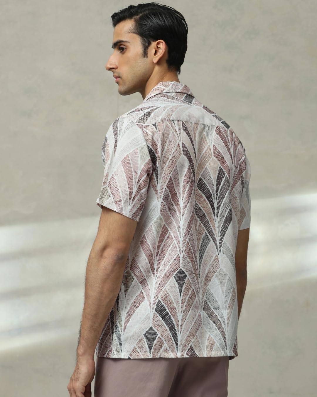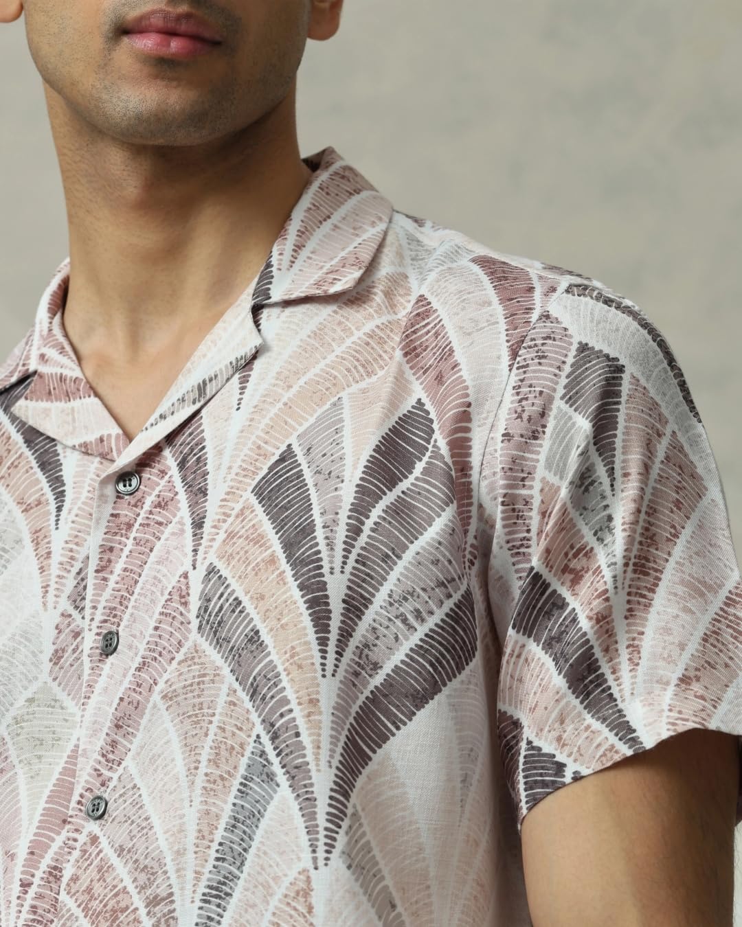 Elevate your casual wear with this striking beige shirt that combines comfort and style. The relaxed fit and short sleeves make it perfect for warm days, while the eye-catching geometric pattern adds a modern twist. Crafted from durable polyester, this regular-type shirt features a trendy camp neckline, offering a laid-back yet fashionable look. It’s an ideal choice for men who appreciate unique designs and want to make a statement with their everyday attire.