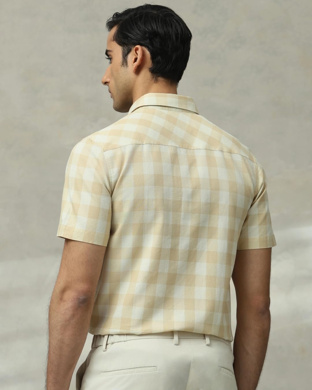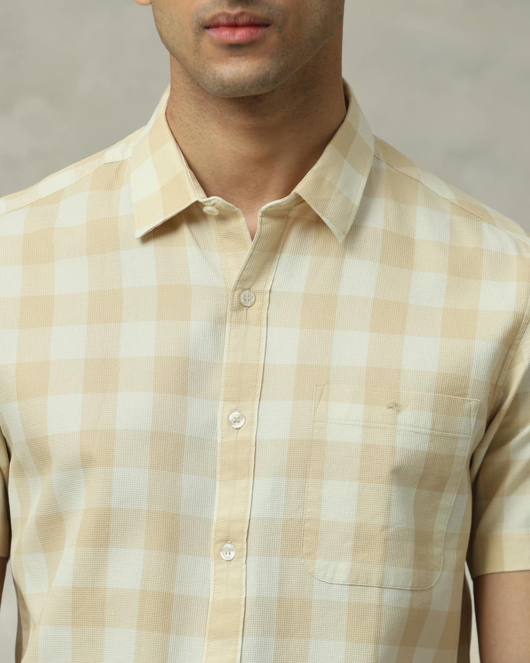 Add a touch of sophistication to your wardrobe with this khaki slim-fit shirt. Crafted from pure cotton, it features a classic checks pattern that never goes out of style. The spread neckline and half sleeves make it perfect for warmer weather or layering. This regular-type shirt combines timeless elegance with modern fit, suitable for both casual and semi-formal occasions.