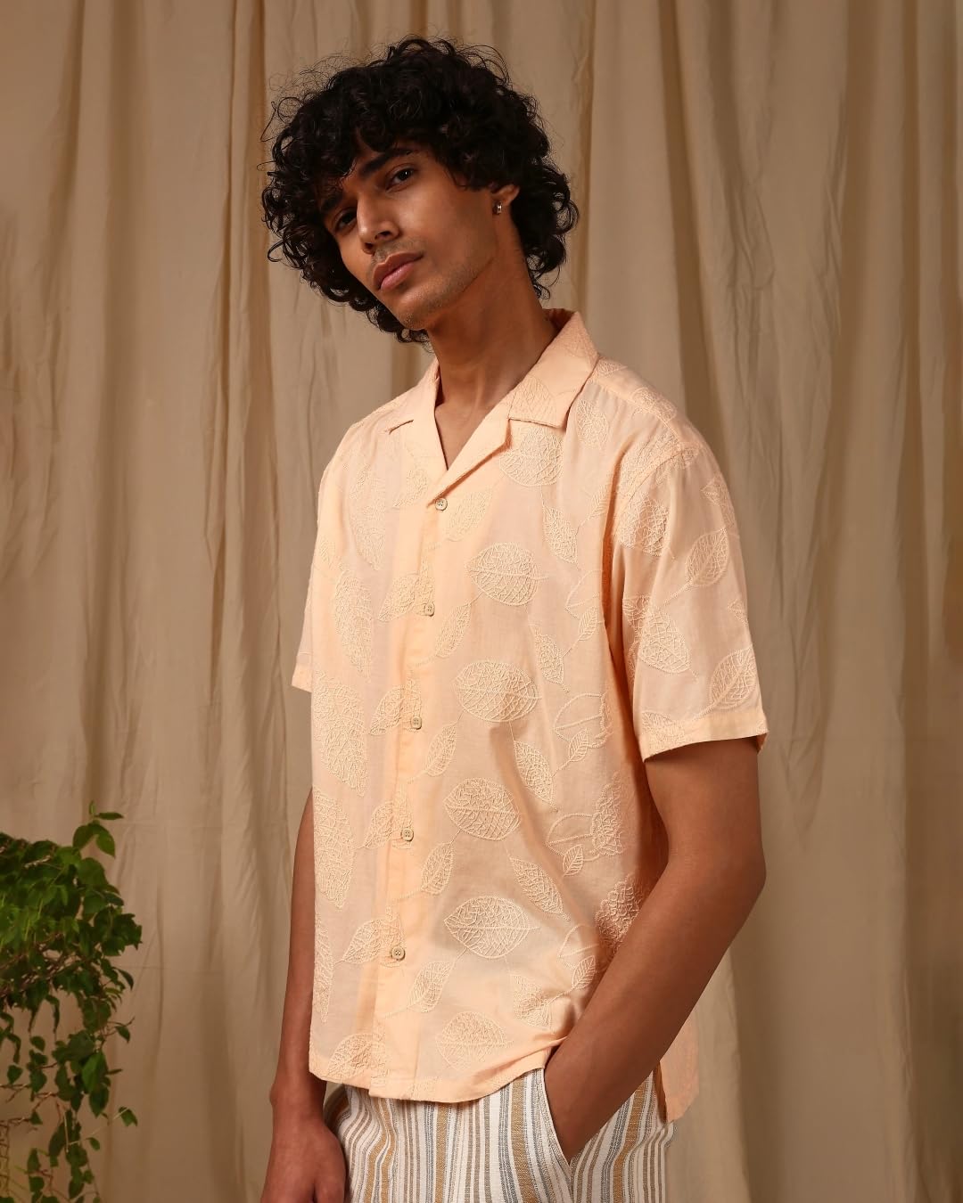 Embrace laid-back style with this off-white loose-fit shirt. The embroidered pattern and camp collar add a unique touch, while the half sleeves keep you cool. Crafted from breathable cotton, this button-up shirt is ideal for casual outings and relaxed social gatherings.