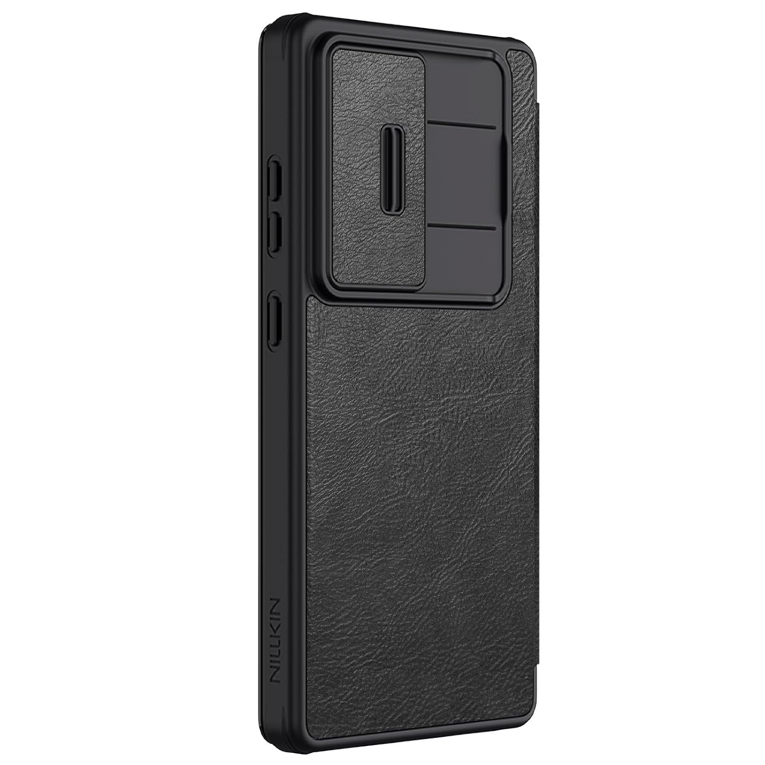 Nillkin Case for Samsung Galaxy S25 Ultra (6.8″ Inch) Qin Pro Camshield Camera Slider Genuine Classic Leather Flip Folio + Card Slot Black Color