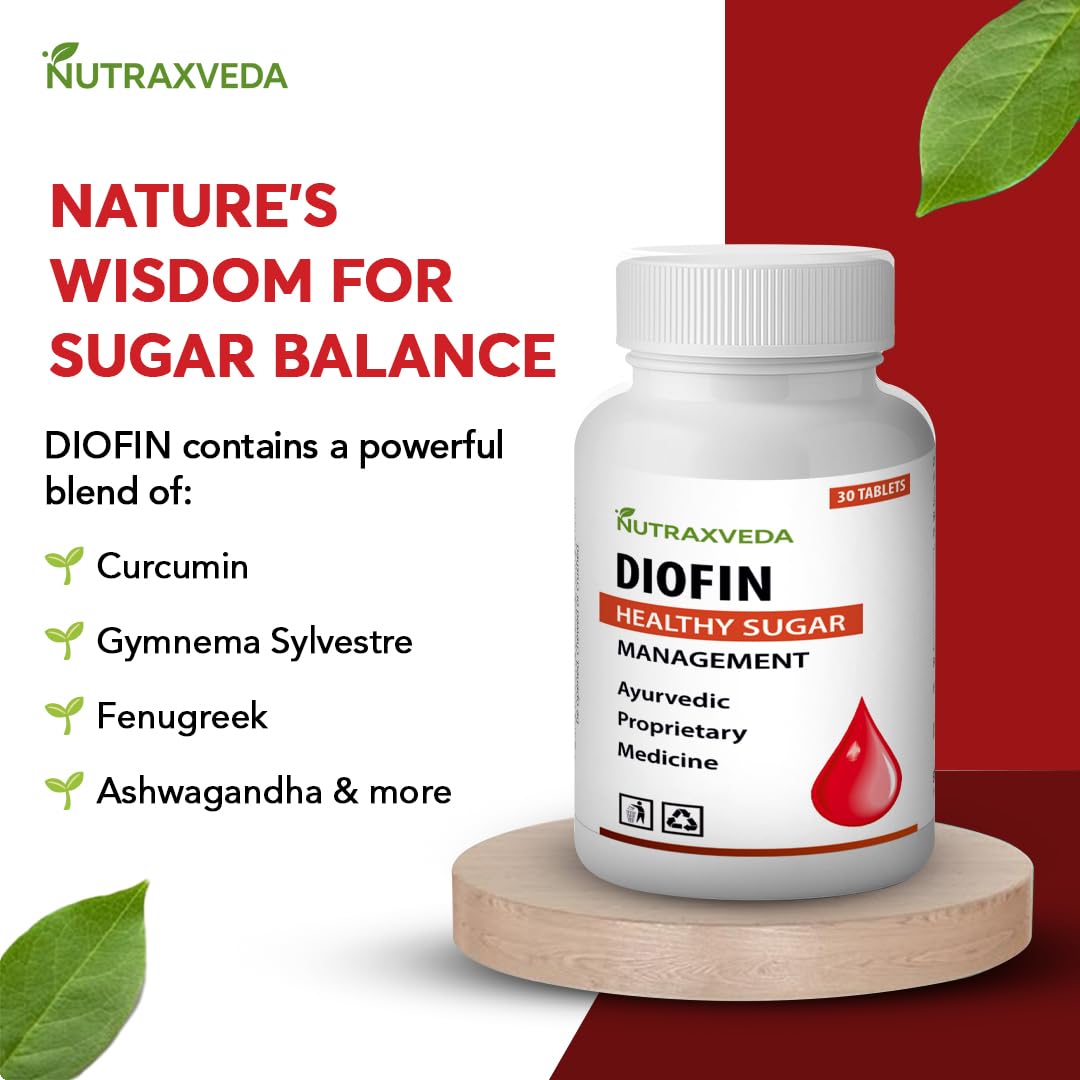Nutraxveda Diofin Healthy Sugar Management Tablets are an Ayurvedic proprietary medicine designed to support healthy blood sugar levels naturally. Crafted using traditional Ayurvedic principles, this herbal formulation helps maintain glucose balance and supports overall metabolic wellness. Diofin works by assisting the body’s natural sugar metabolism, making it a suitable daily wellness supplement for individuals looking to manage their sugar levels through natural means. When combined with a balanced diet, regular exercise, and a healthy lifestyle, it contributes to long-term diabetic wellness. These tablets are made using carefully selected herbal ingredients and are free from harsh chemicals, making them suitable for regular consumption. The convenient 30-tablet pack ensures easy daily intake and consistent wellness support. Choose Nutraxveda Diofin for a trusted Ayurvedic approach to healthy sugar management and metabolic balance.