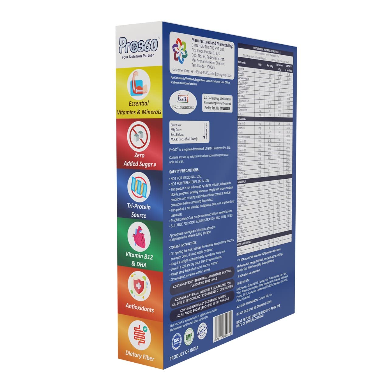 DIABETES PROTEIN POWDER : Made with Tri-Protein Formula with Rich additions of Fibre, Essential Vitamins, Minerals and Amino Acids. Pro360’s unique formula provides an amazing dose of Protein as well. The Tri-Protein Formula consists of Skimmed Milk powder, Whey Protein, and Soy Protein – The combination that makes an ideal Protein-Rich meal.