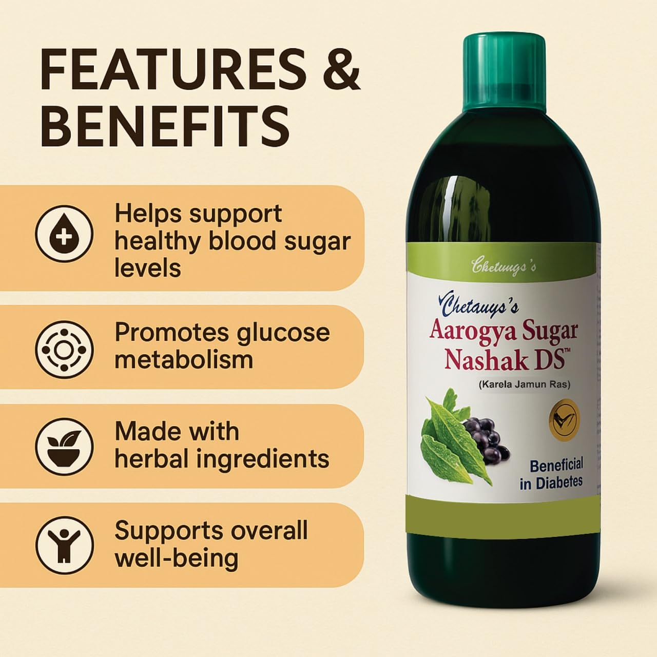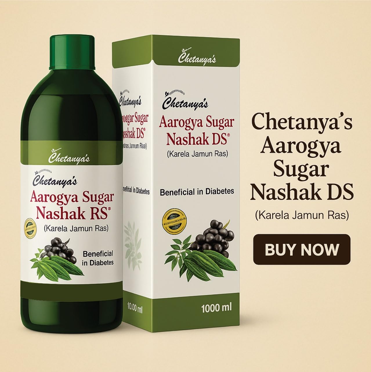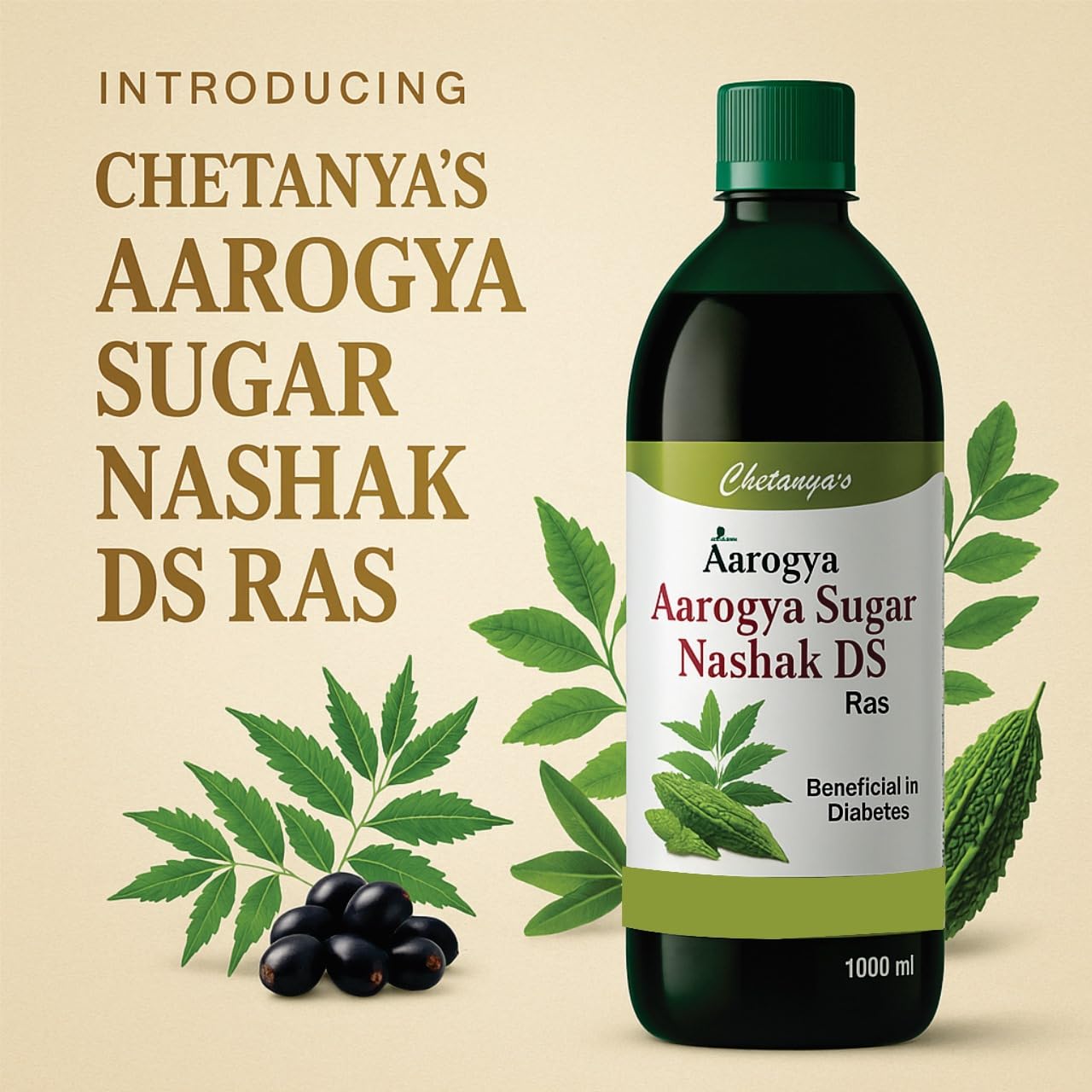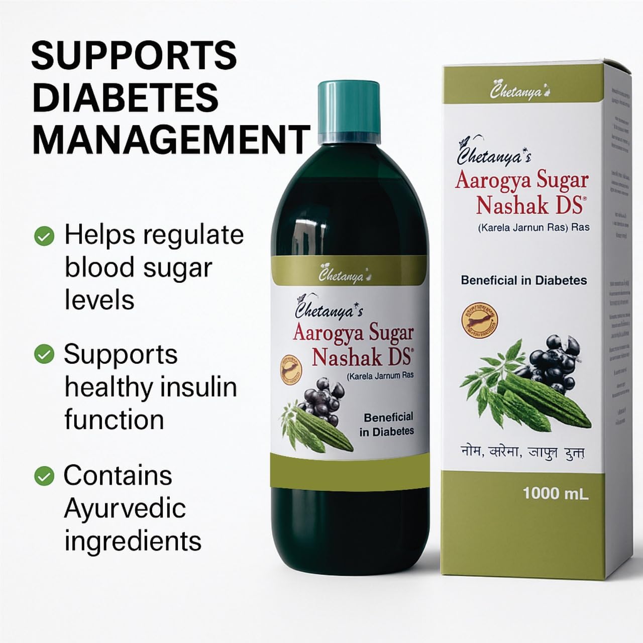 Take control of your blood sugar levels the natural way with Chetanya’s Sugar Nashak DS, a powerful Ayurvedic formulation designed to support healthy glucose metabolism. Enriched with scientifically backed herbs like Karela, Jamun, Neem, and Gurmar, this 1000 ml tonic helps manage diabetes while promoting overall wellness Note:- This is an Ayurvedic proprietary medicine formulated under the license granted by the AYUSH department. Manufactured as per the provisions of the Drugs and Cosmetics Act, 1940 and Rules, 1945. For adult use. Consult an Ayurvedic practitioner or physician before use.