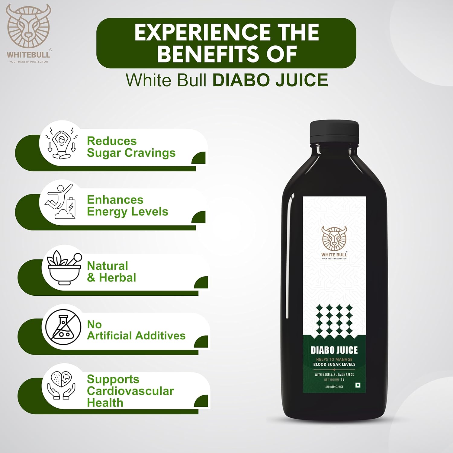 Natural Blood Sugar Support with Herbal Extracts – The WHITE BULL Diabo Tea & Diabo Juice Combo is formulated with a powerful blend of natural herbs known for their ability to support healthy blood sugar levels. Ingredients like Jamun, Gudmar, Karela, and Giloy work synergistically to help regulate glucose absorption, promote insulin sensitivity, and support overall diabetes management.