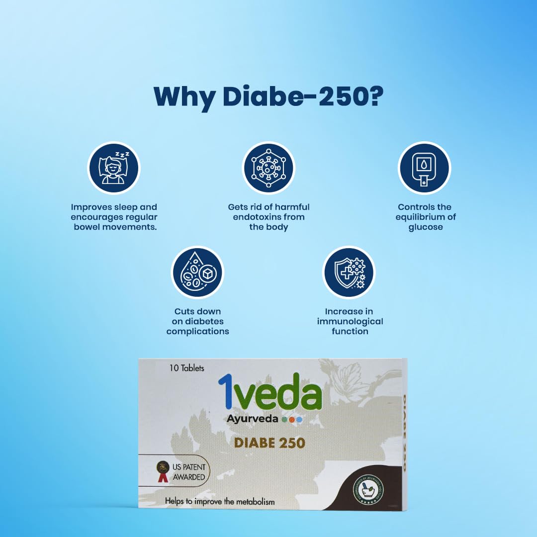 1 Veda Diabe 250 |US-patented medicine for diabetes | Control Blood Sugar Level | Herbal diabetic support formula | Maintains Healthy Glucose Levels | Blend of Haridra, Jambu, Haritaki, Daruharidra to manage sugar level.