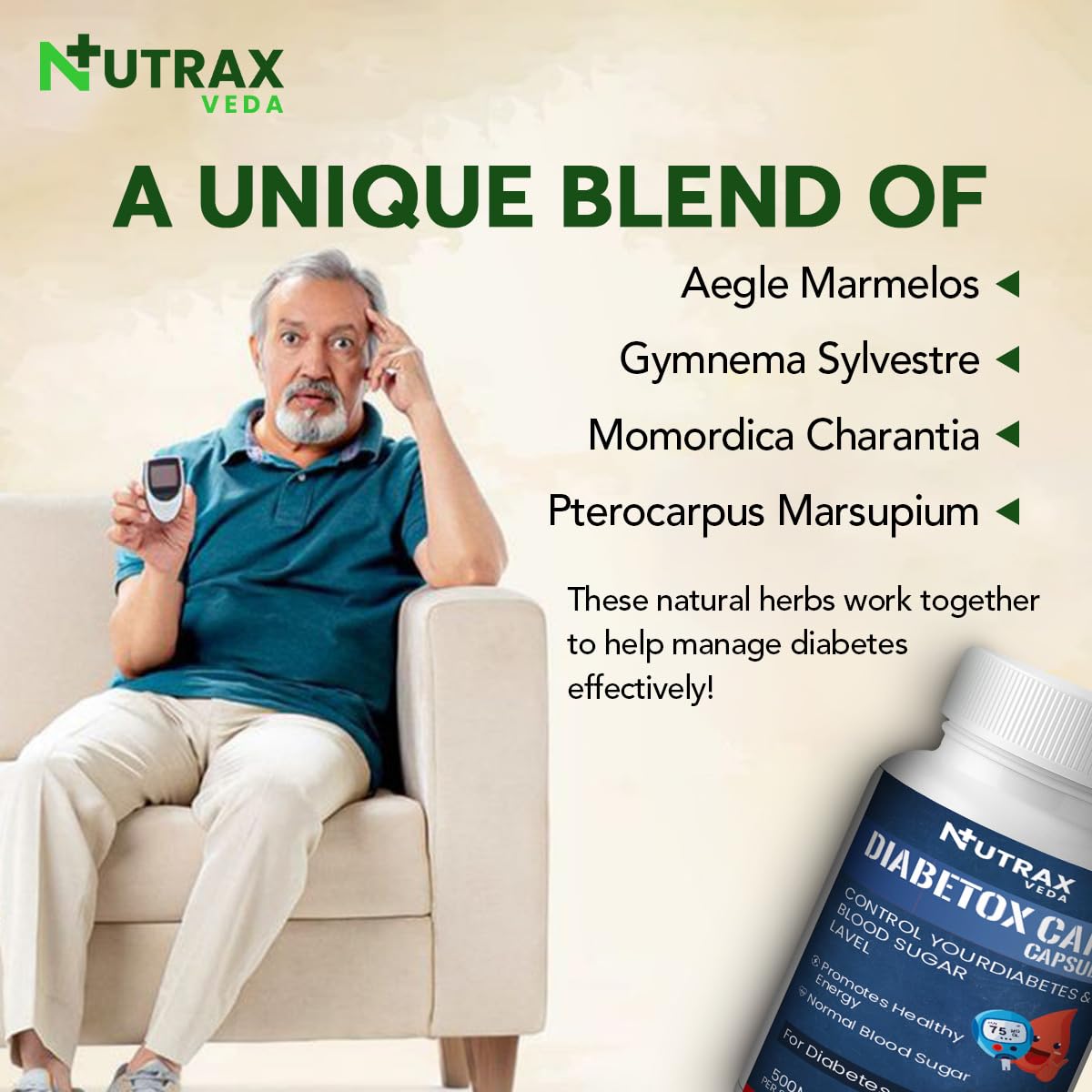 Nutrax Veda Diabetox Care Capsules, Natural Blood Sugar Support Supplement with Gymnema Sylvestre, 500mg, 30 Capsules for Diabetes Management