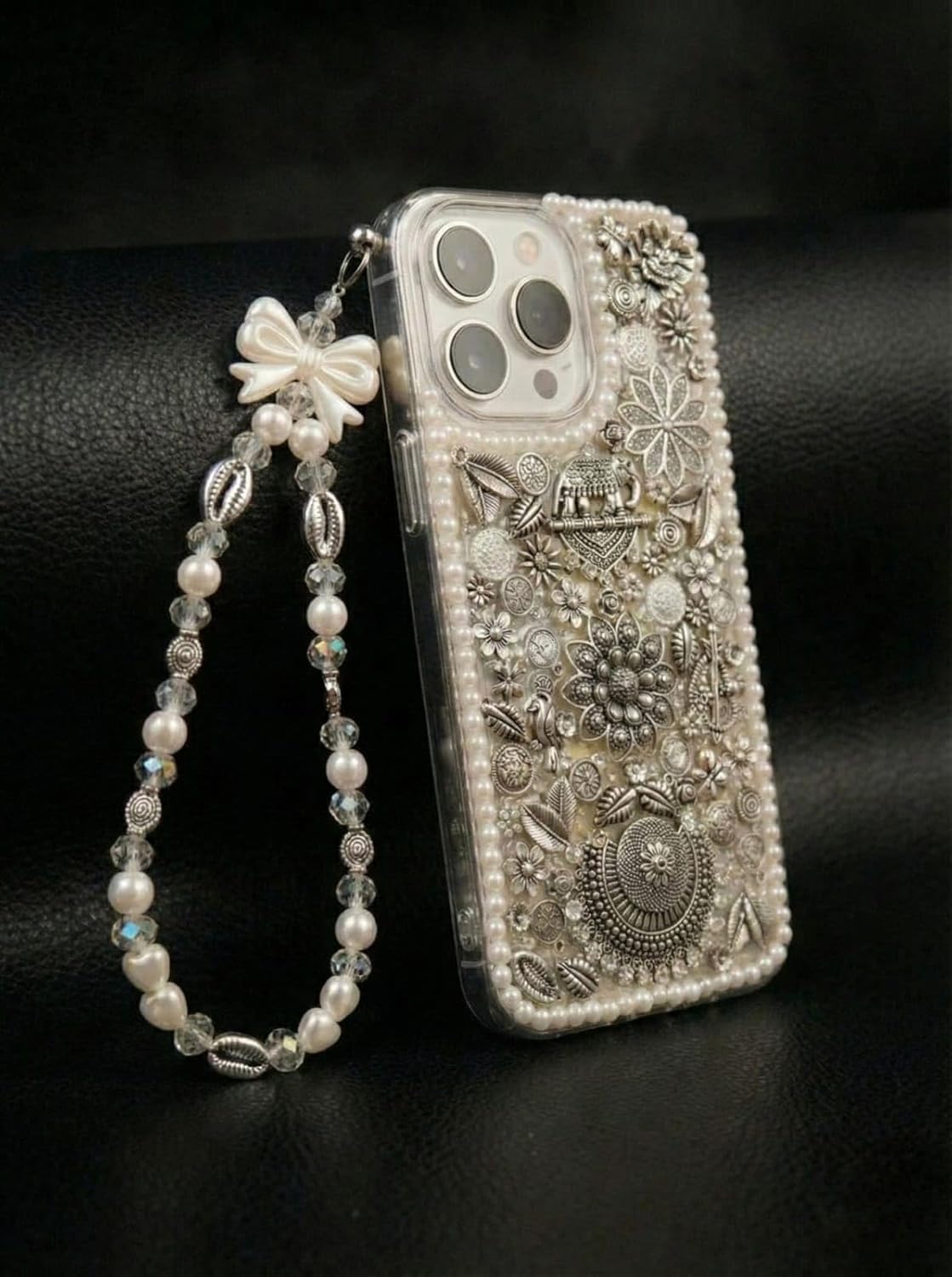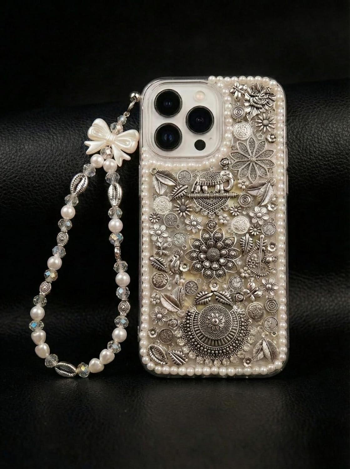 Transform your iPhone into a dazzling fashion statement with this luxurious decorative phone case. This stunning accessory features an intricate floral crystal embellished design in elegant silver tones, adorned with meticulously arranged pearls, rhinestones, and ornate metallic flowers that catch the light beautifully. Each decorative element is carefully handcrafted to create a sophisticated vintage-inspired aesthetic that elevates your device beyond ordinary protection. The case comes complete with a matching pearl beaded wrist strap, featuring a charming bow detail and mixed beads in complementary tones, providing both convenience and style. The wrist strap allows for hands-free carrying whilst adding an extra touch of elegance to your ensemble. Designed specifically for iPhone models with precision cutouts for camera lenses and ports, this case offers reliable protection without compromising on glamour. Perfect for special occasions, festive celebrations, or anyone who appreciates distinctive accessories that showcase their unique style. The intricate embellishments make each case a wearable work of art that’s sure to attract admiring glances wherever you go.