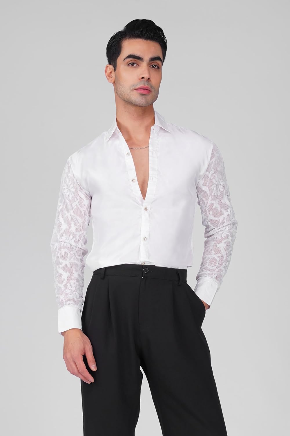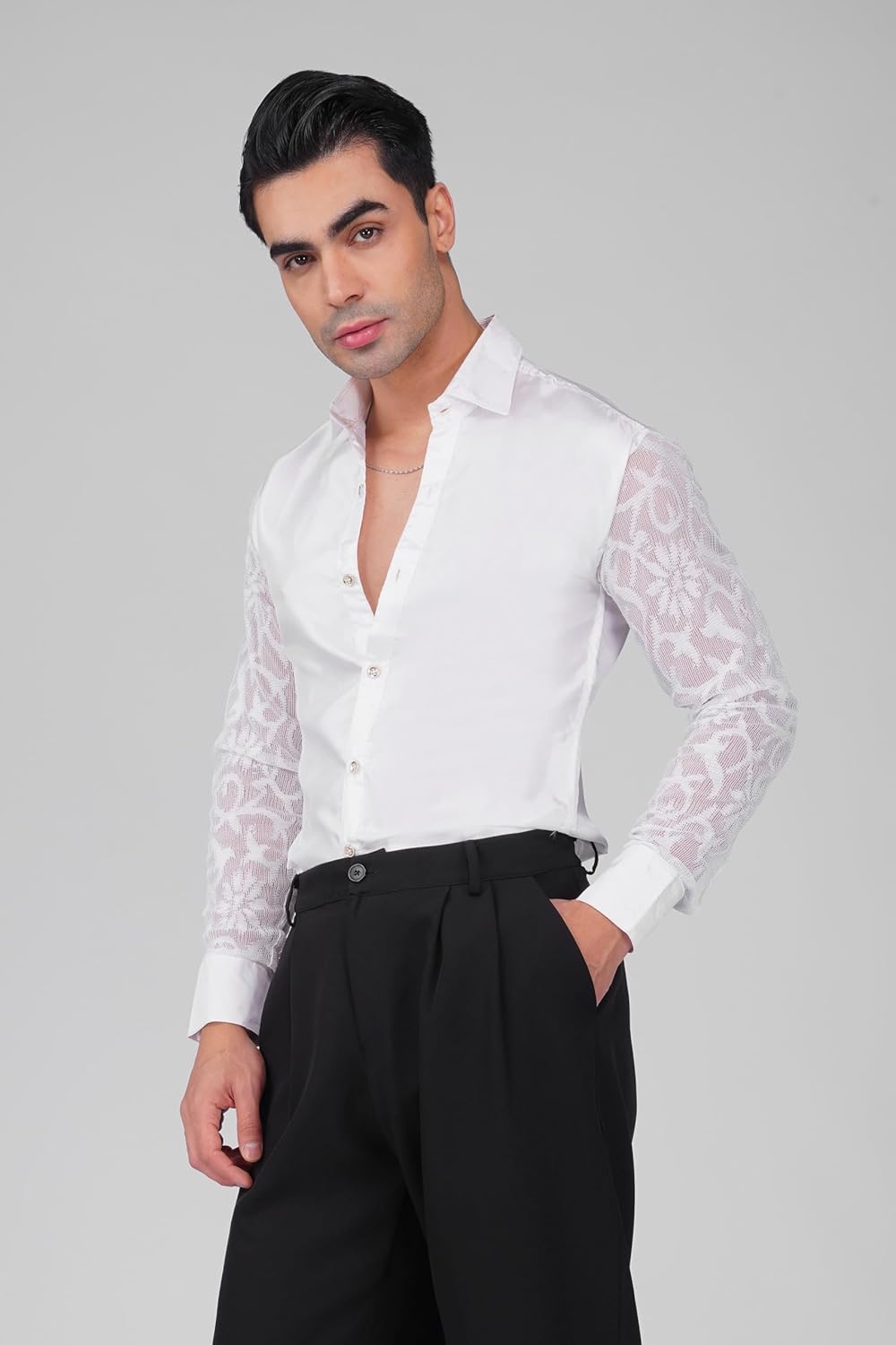 Men’s Lace Sleeve Dress Shirt, Transparent Lace Detail, Button Down, Long Sleeve