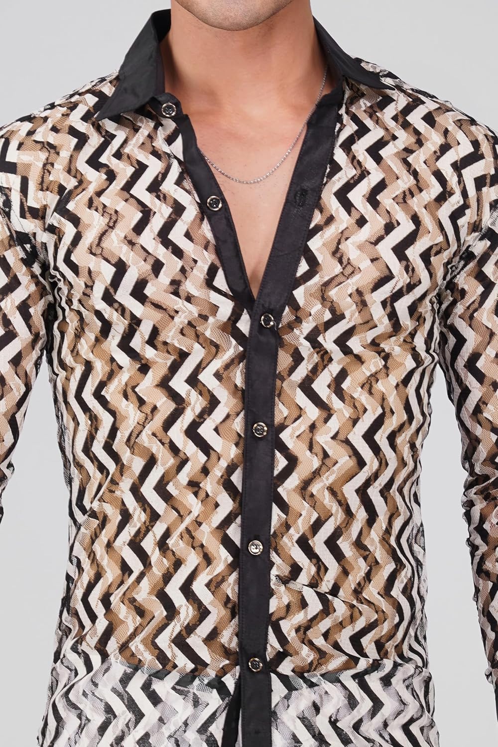 This striking men’s transparent party wear shirt is designed to make a bold statement at any special occasion. Featuring an eye-catching chevron pattern in shades of beige, brown, and black, this long-sleeve shirt combines contemporary style with a daring edge. The semi-transparent fabric creates a modern, fashion-forward look that’s perfect for parties, nightclub outings, and festive celebrations. Contrasting black collar and cuffs add a sophisticated touch whilst framing the distinctive zigzag pattern beautifully. The shirt’s unique see-through design allows you to layer it creatively over a solid-coloured vest or wear it confidently on its own for maximum impact. The comfortable fit ensures you can move freely whilst dancing or socialising, making it as practical as it is stylish. This versatile piece pairs effortlessly with white or beige trousers for a coordinated look, or with dark jeans for a more casual yet trendy ensemble. Whether you’re attending a wedding reception, a festive gathering, or a night out with friends, this transparent chevron shirt will ensure you stand out from the crowd. The button-down front and full-length sleeves provide classic shirt functionality with a contemporary twist. Please check the sizing chart carefully before placing your order to ensure the perfect fit.