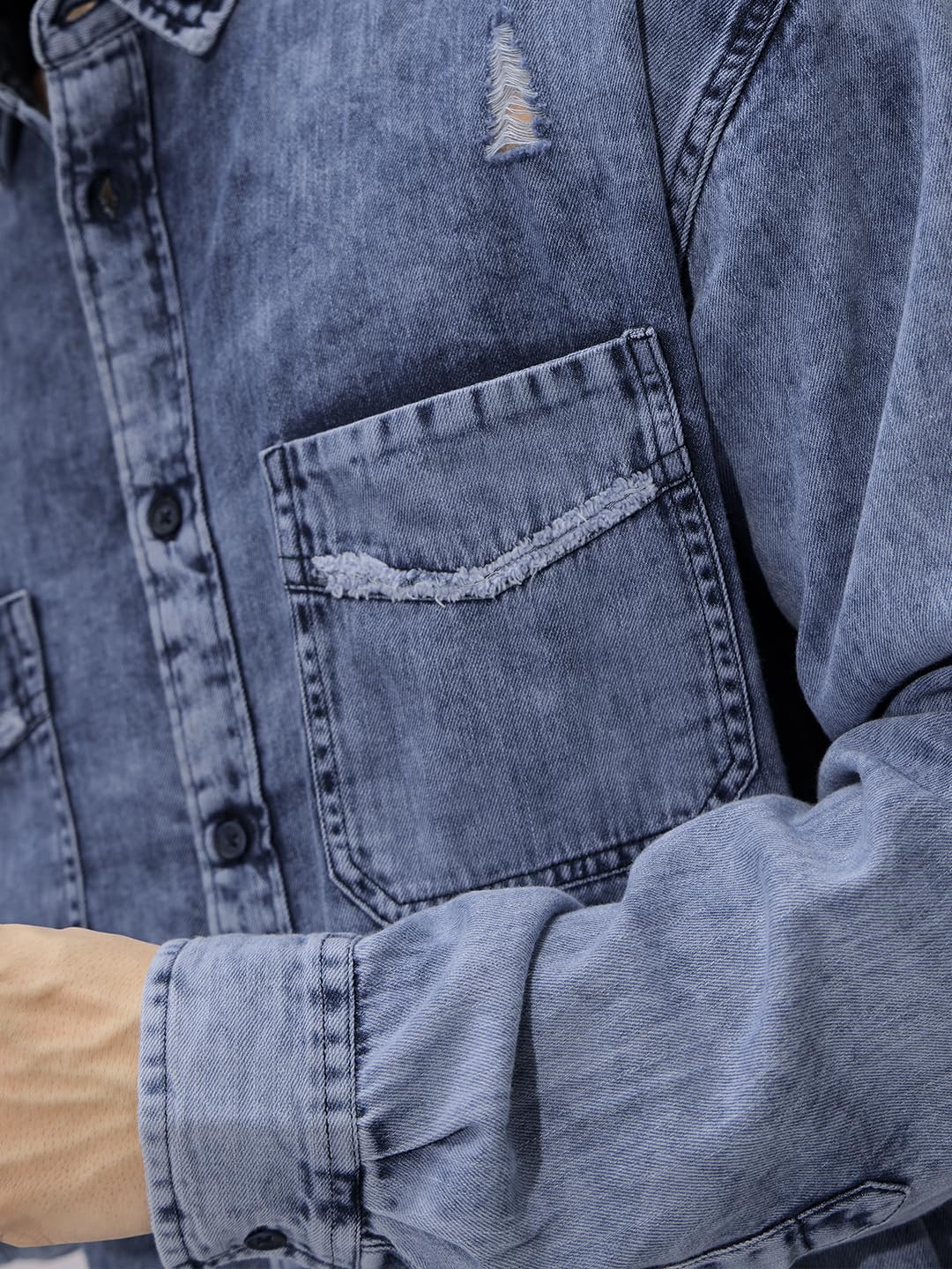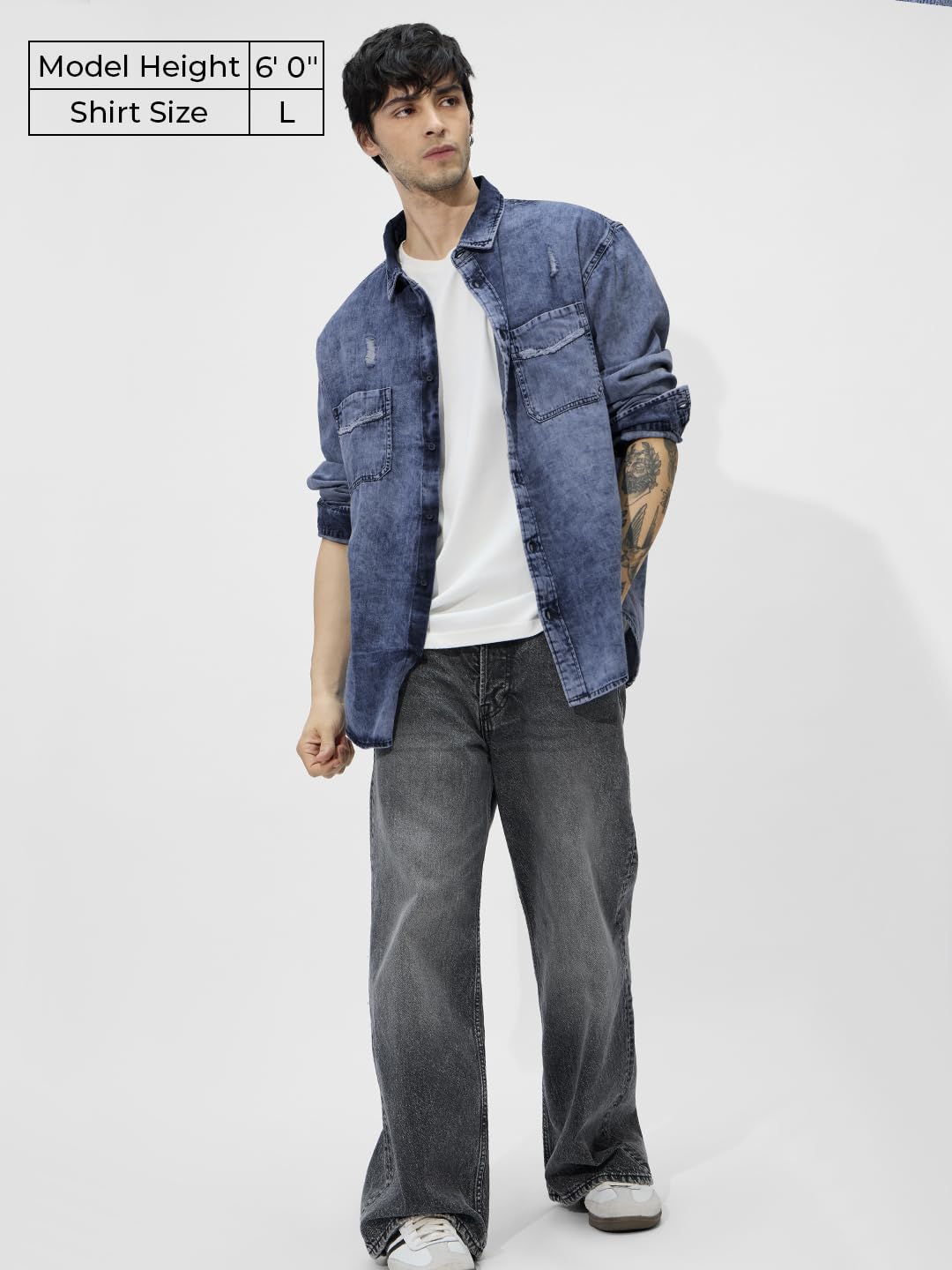 The Souled Store Classic Denim Shirt: Blue Men and Boys Long Sleeves Collared Neck Button Front Cotton Relaxed Fit Denim Shirts