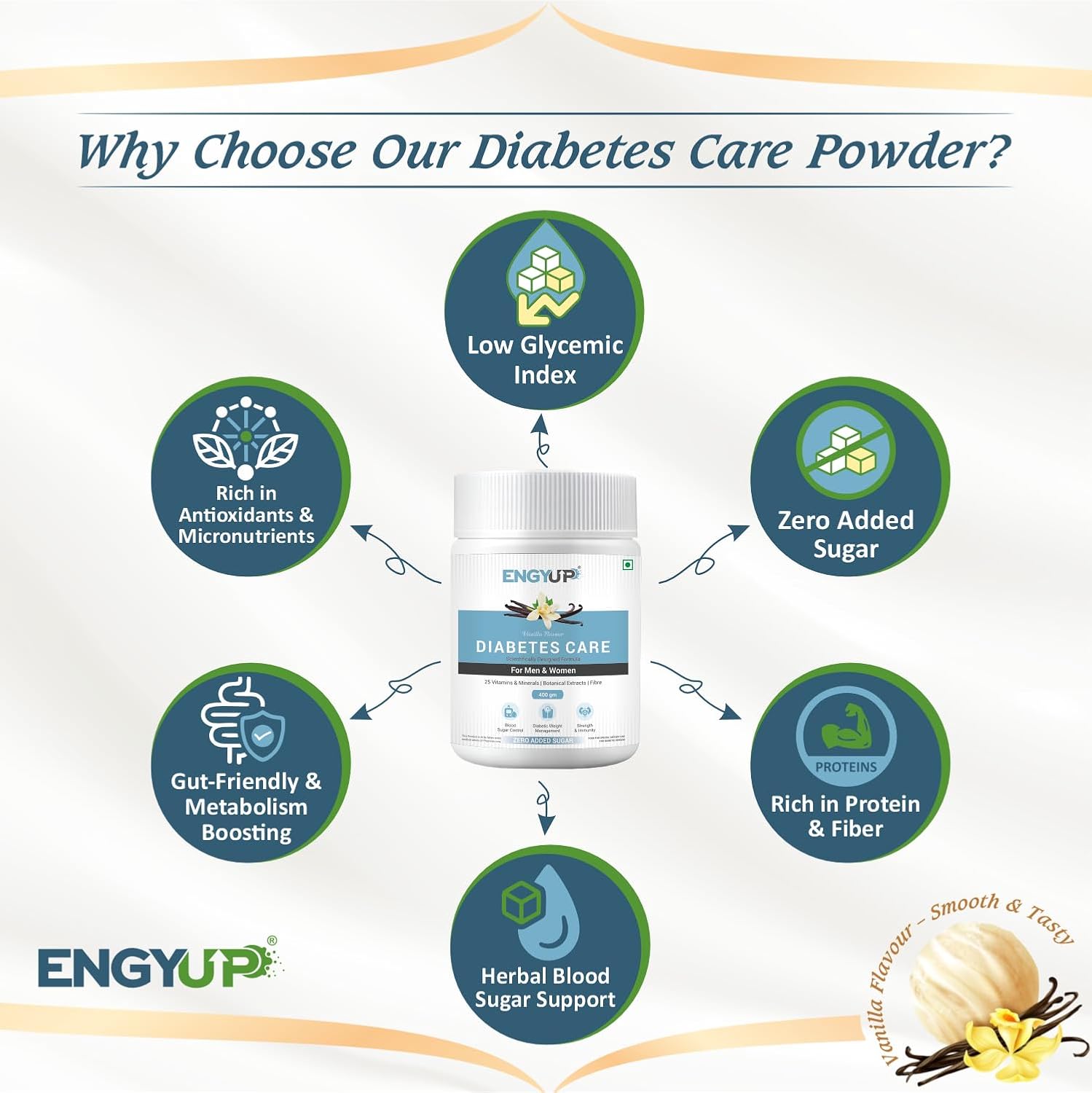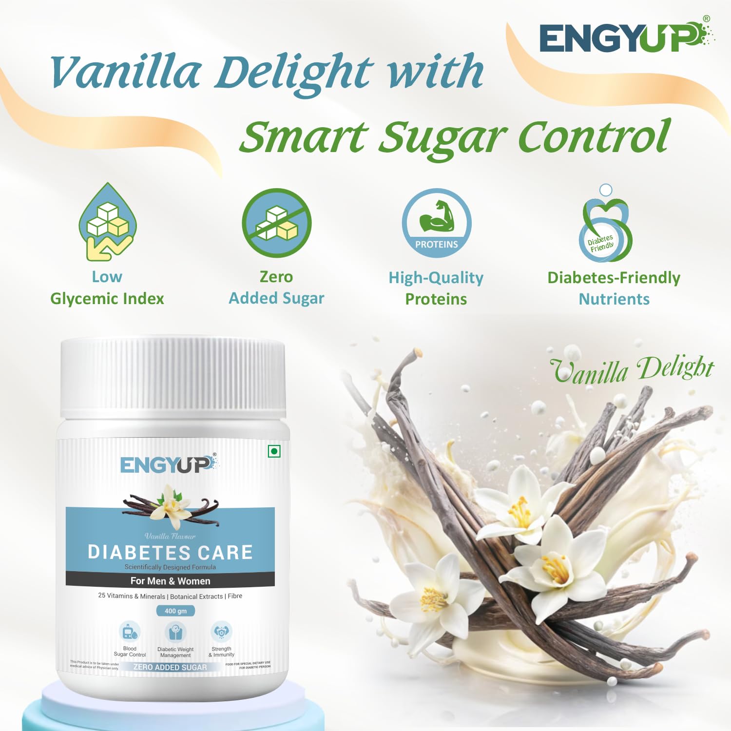 Diabetes Care Powder | Scientifically Designed Formula | Triple Blend Protein with Low GI & Zero Added Sugar | Vitamins & Minerals, Herbal Extracts | Vanilla Flavor | 400g