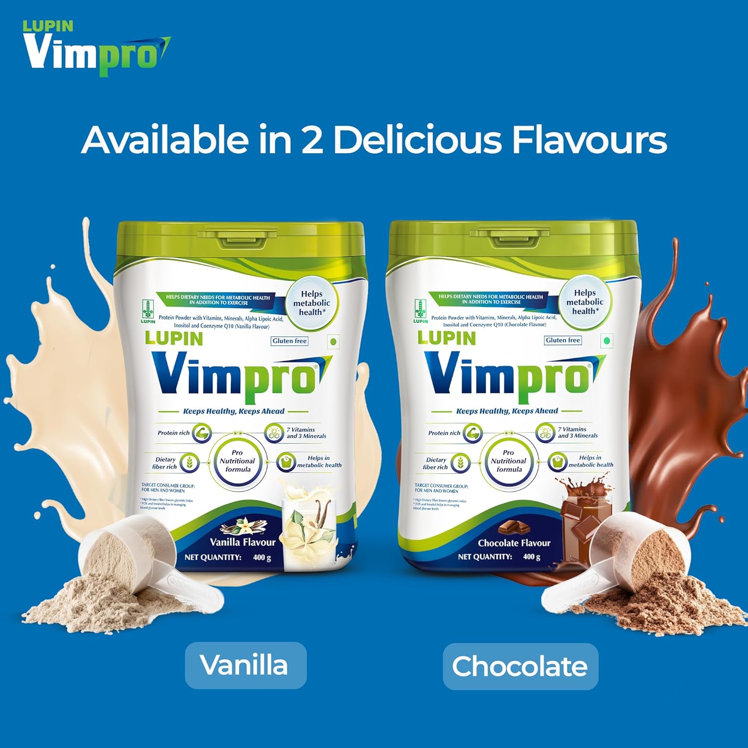 Lupin Vimpro Nutritional Vanilla Protein Powder, Supports Muscle Strength & Growth, Helps in Heart and Brain Health, Helps in Recovery, No Gluten, Protein Supplement with CoQ10, ALA, Inositol & FOS, With Vitamin Minerals & Protein, 400g