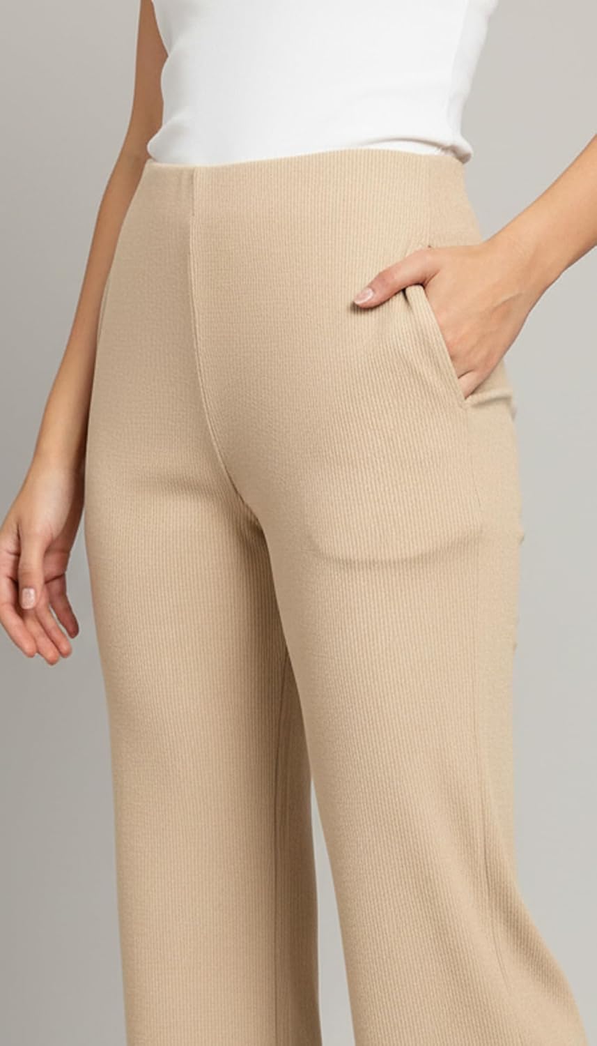 Mehrang High Waisted Wide Leg Ribbed Knit Trousers with Pockets | Casual and Stretchy Pants | for Women